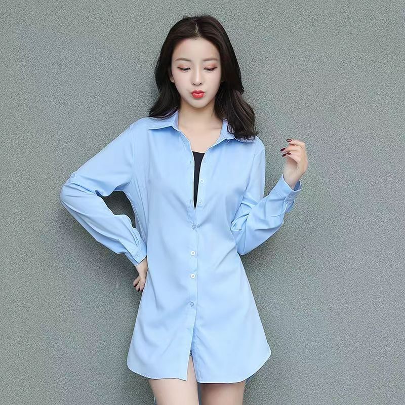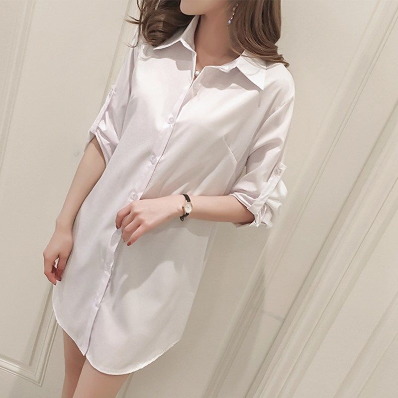 흰색 셔츠 여성 봄, 가을 새로운 긴팔 느슨한 한국 스타일 다목적 대형 여성 중간 길이 BF 기본 셔츠 인치 여성스토어 가기