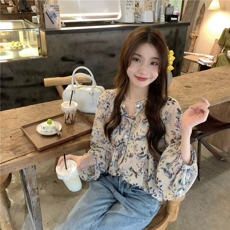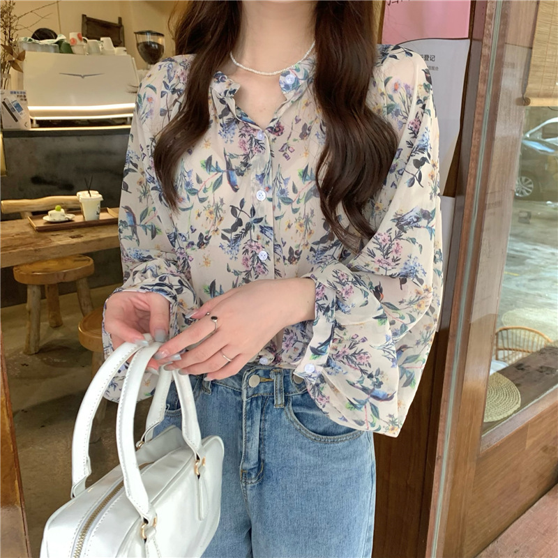 리얼 샷 여름 프랑스 스타일 세련된 꽃 셔츠 탑 여성용 한국 스타일 꽃 셔츠 긴 소매 자외선 차단제 쉬폰 셔츠 43468스토어 가기