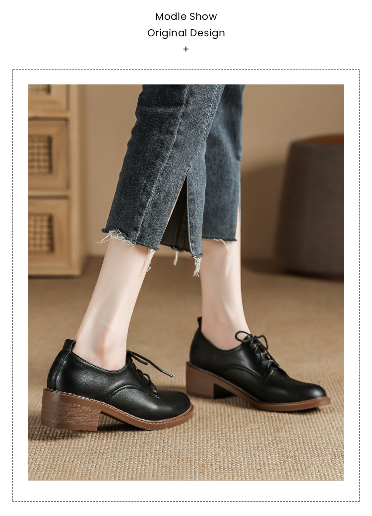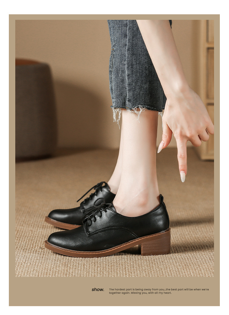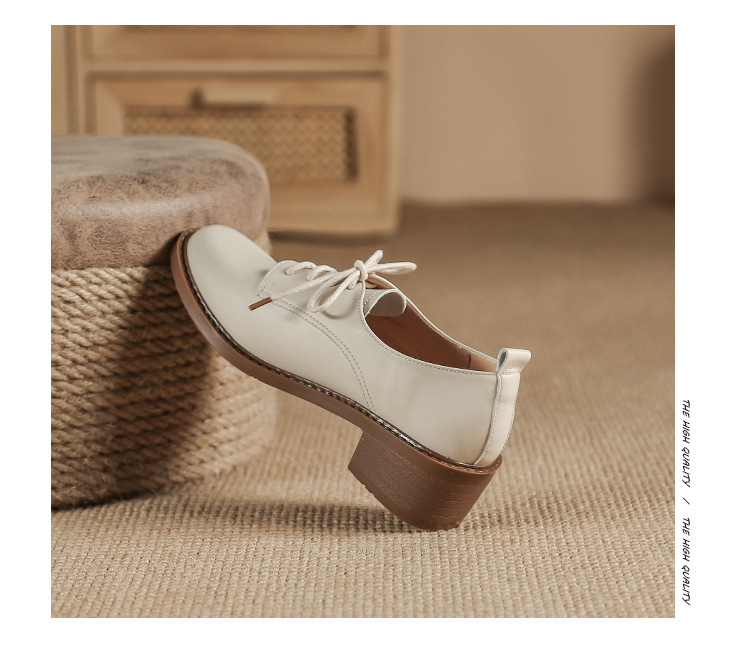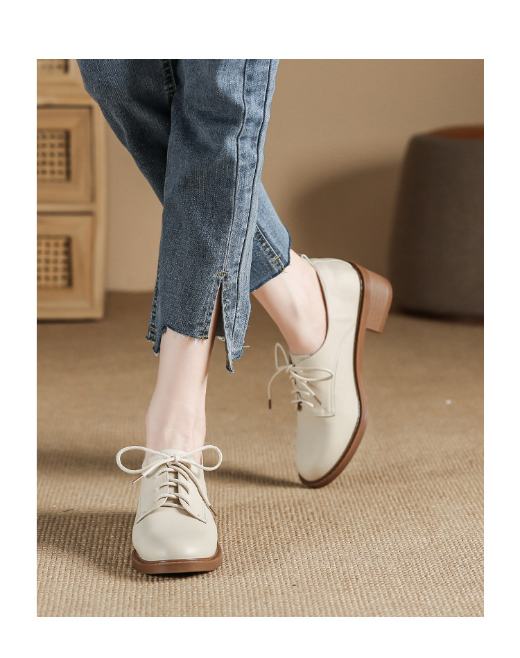 심플하고 활용도가 높은 레이스업 천연가죽 여성화, 부드러운 밑창, 봄, 가을에 편안하고 심플하며 스커트와 함께 잘 어울리는 작업용 두꺼운 굽 브로그 슈즈스토어 가기