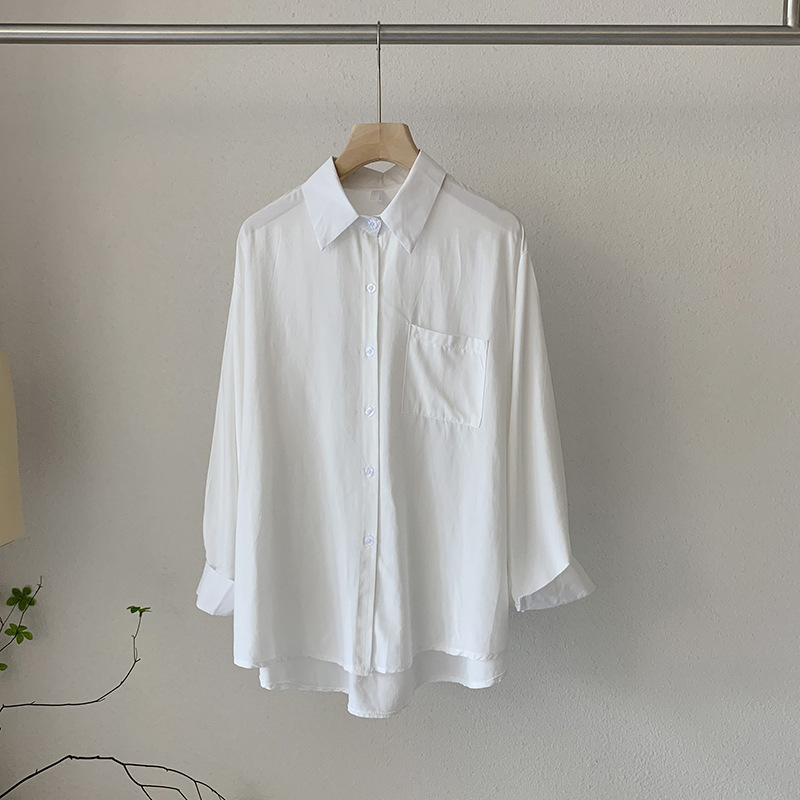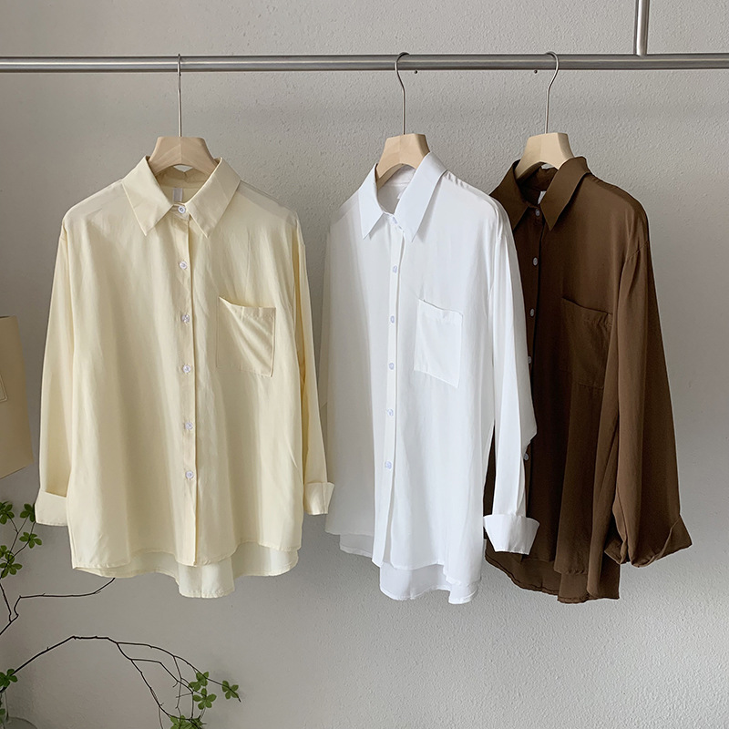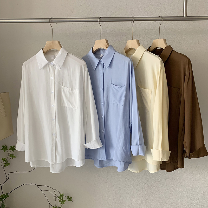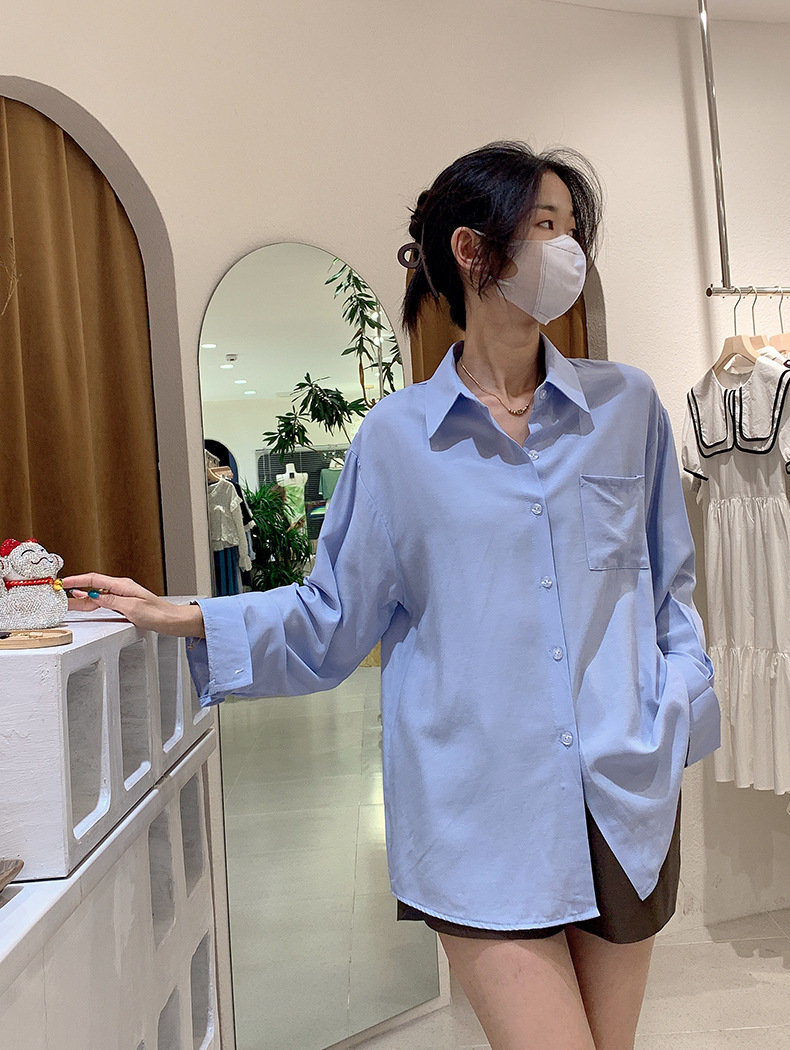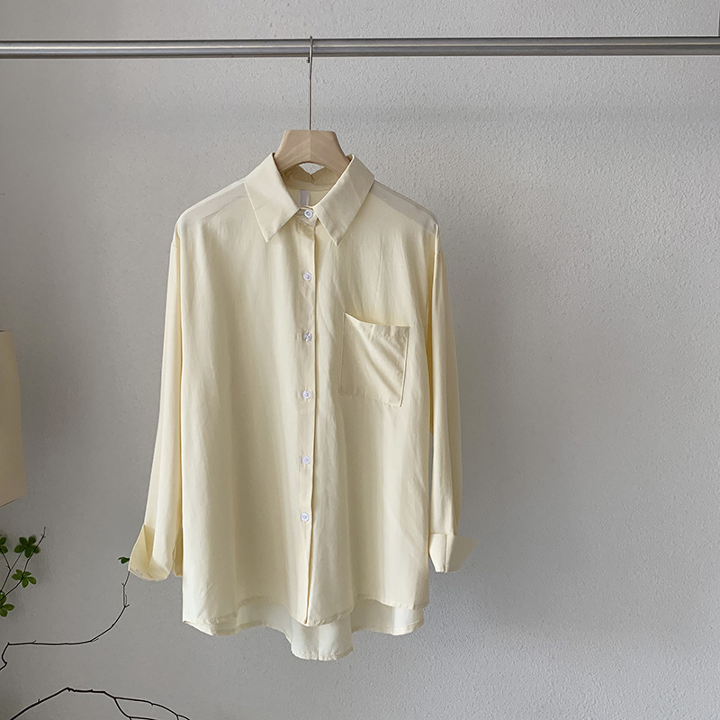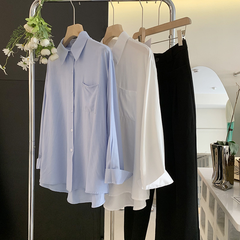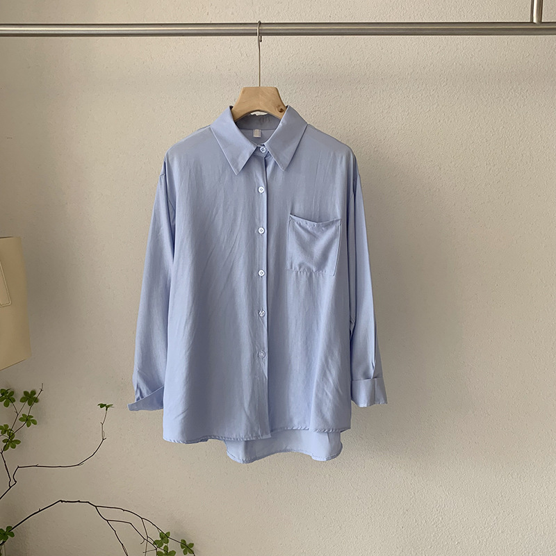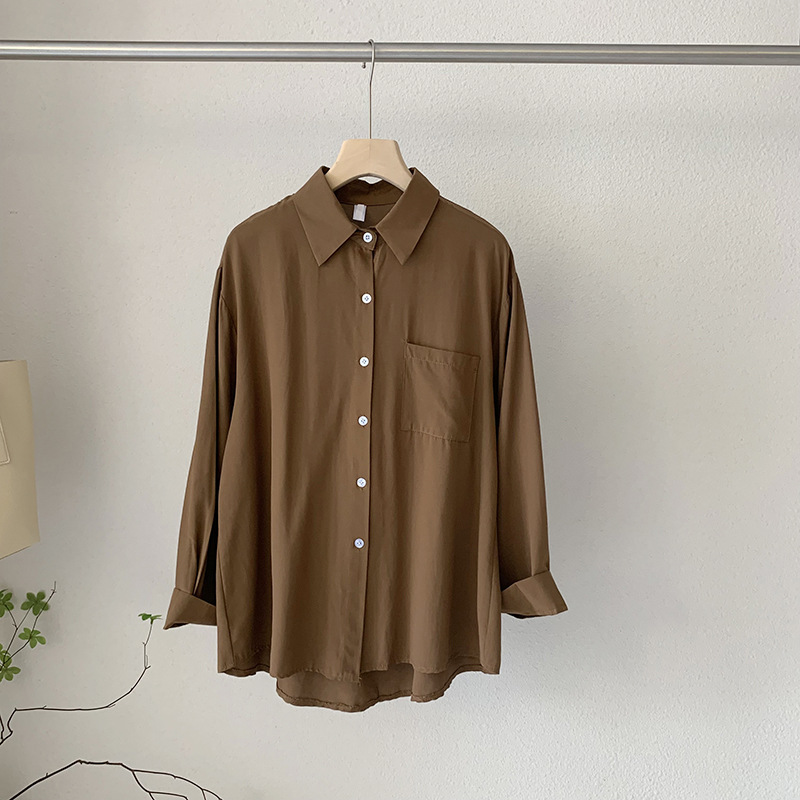 2025 봄 신상품 여성용 대형 포켓 싱글 브레스트 솔리드 컬러 긴팔 중간 길이 셔츠 탑 도매 8465