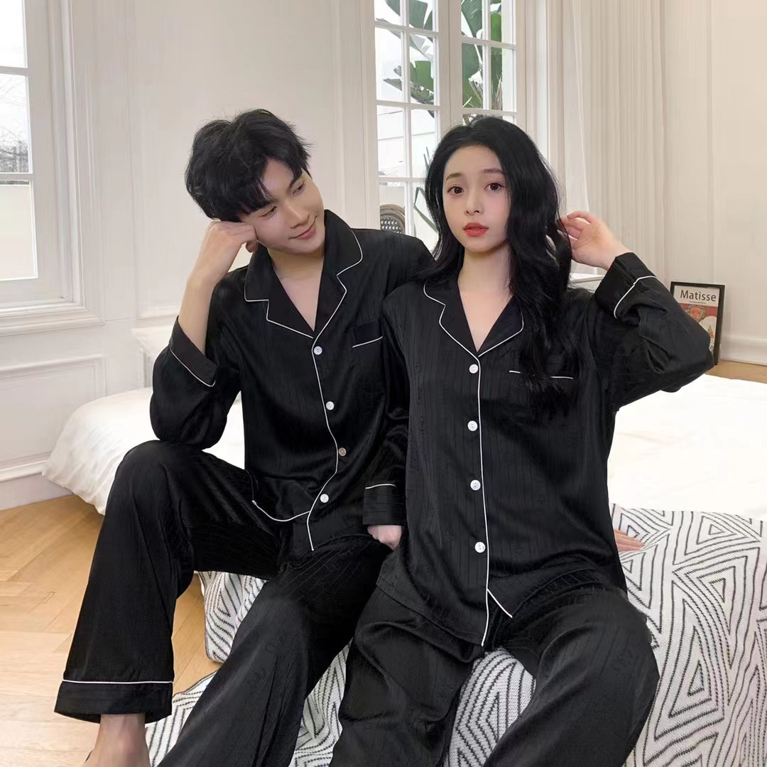 22 이른 가을 새로운 단색 커플 가정 옷 아이스 실크 세트 긴 소매 바지 남자의 자카드 편지 흑백 잠옷