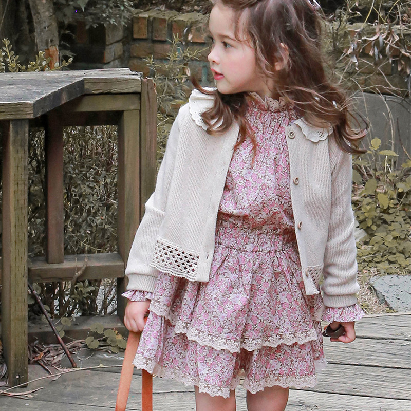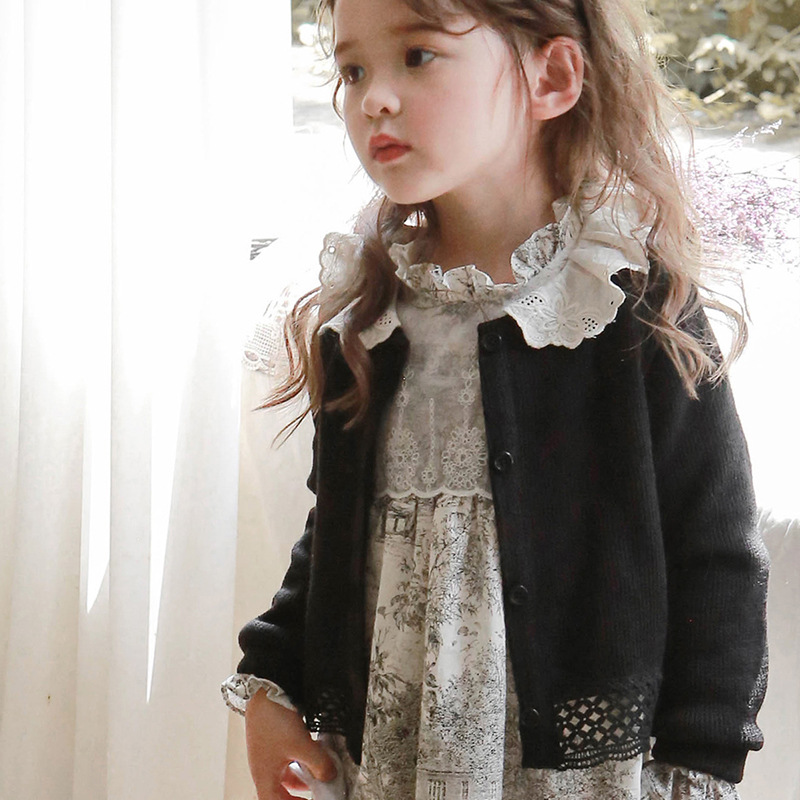 여자 카디건 새로운 딸기 무당 한국 스타일 2024 봄 옷 어린이 소녀 스타일러스틱 레이스 니트 라운드 넥 쇼트 코트스토어 가기
