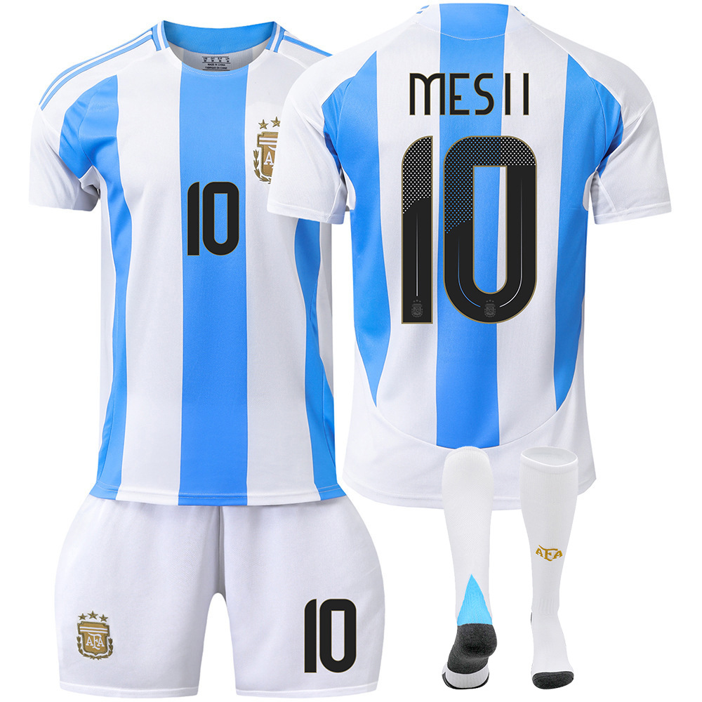 2022 국가 대표팀 아르헨티나 저지 No. 10 메시 성인 어린이 축구 유니폼 세트 남자와 여자의 인쇄 팬 버전