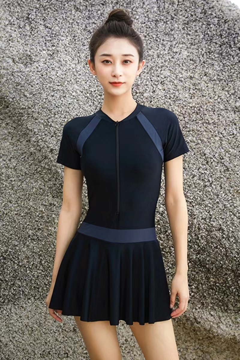 여름 새로운 원피스 대비 컬러 스티칭 수영복 학생 스커트 스타일 보수적 인 수영복 가슴 패드 원피스 수영복 도매
