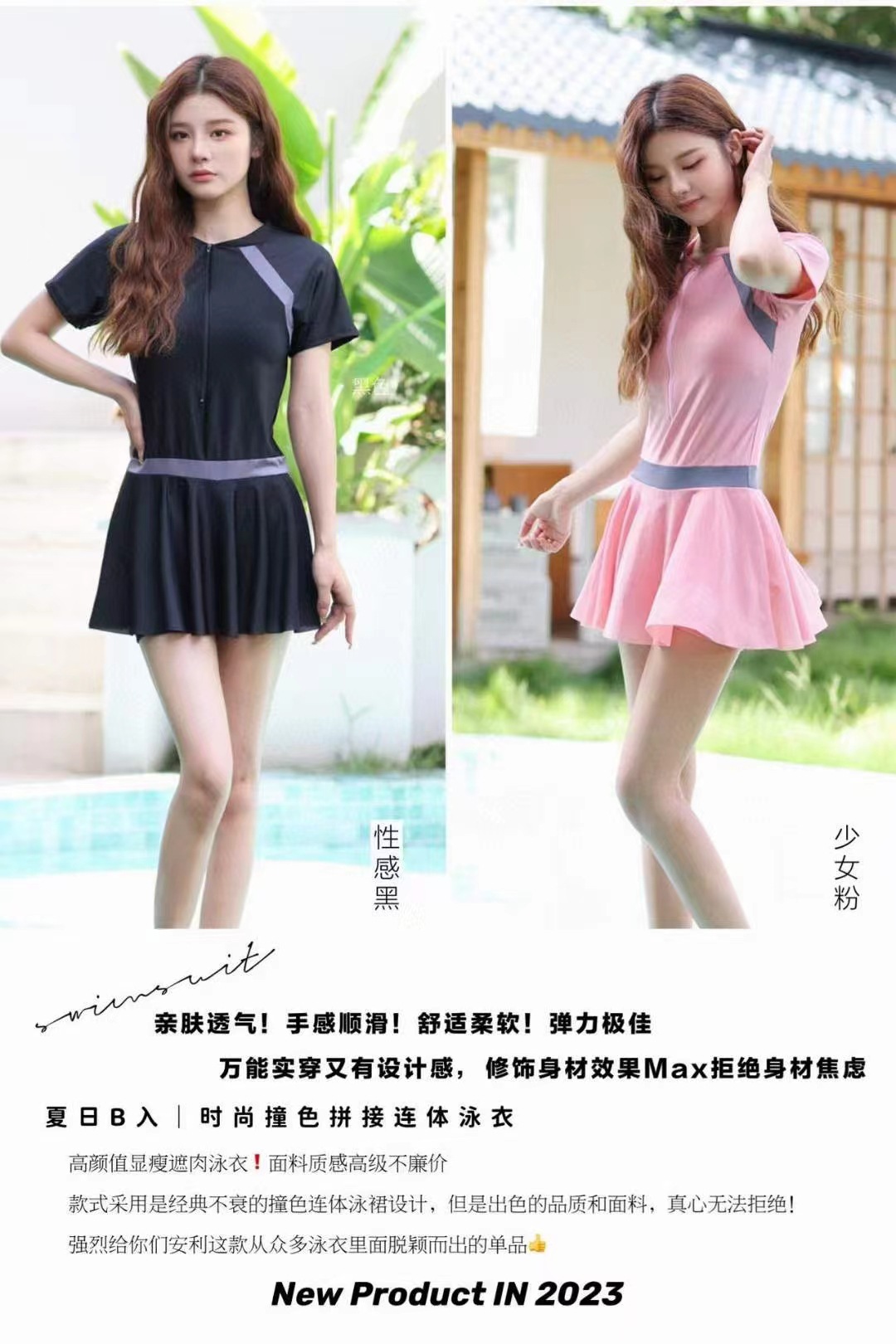 여름 새로운 원피스 대비 컬러 스티칭 수영복 학생 스커트 스타일 보수적 인 수영복 가슴 패드 원피스 수영복 도매스토어 가기