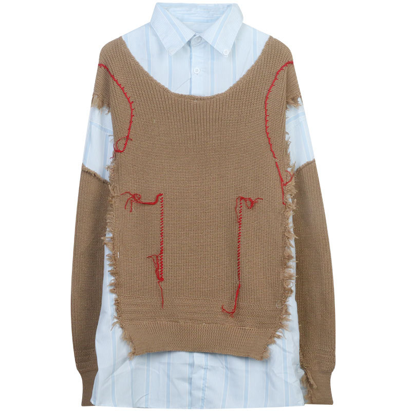가을 여자의 니트 풀오버 2023 새로운 셔츠 스웨터 가짜 투피스 스티칭 디자인 롱 탑