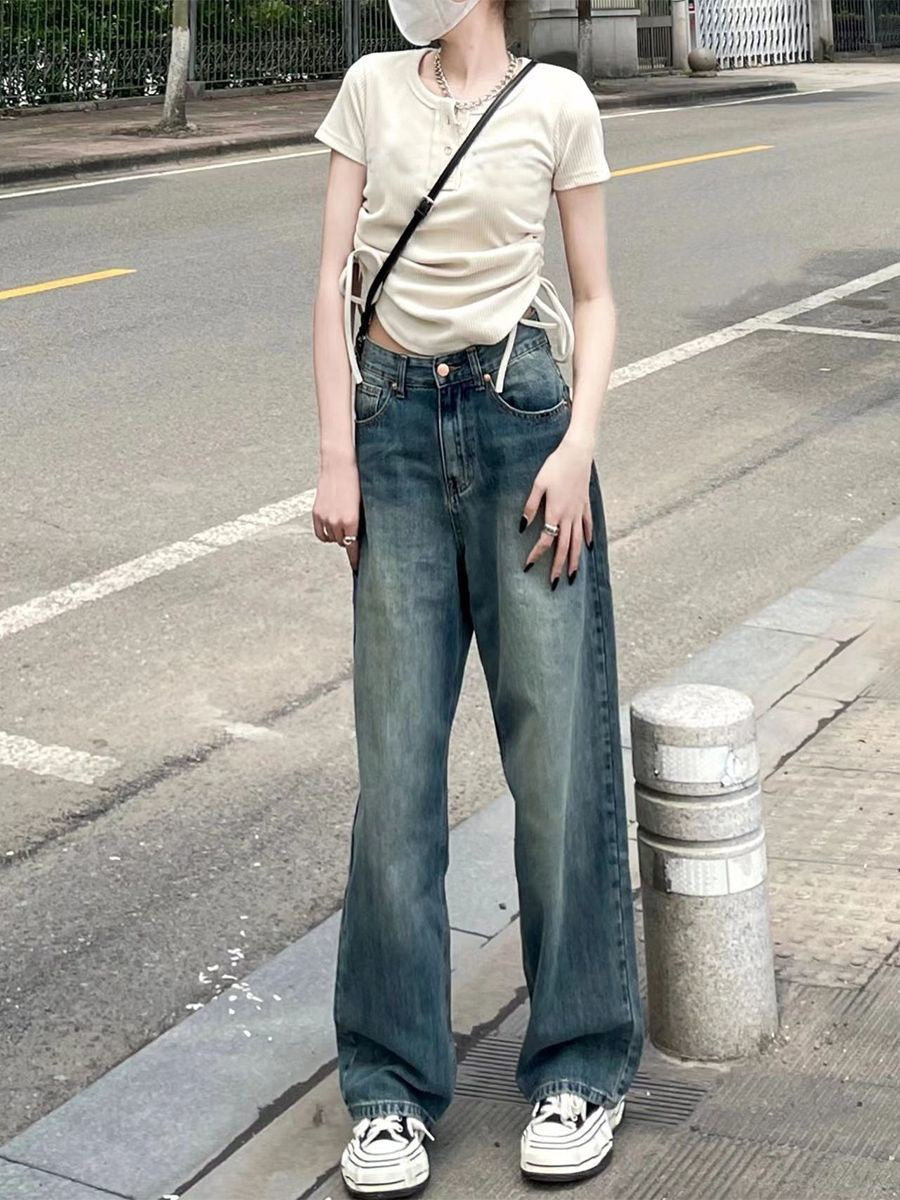블루 하이 웨이스트 스트레이트 느슨한 청바지 여성을위한 2023 가을 복고풍 디자인 넓은 다리 걸레 바지스토어 가기