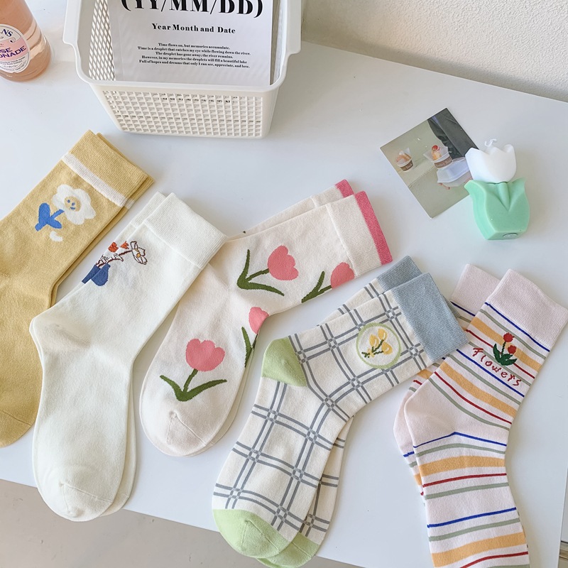 인터넷 유명 인사 신선한 체크 무늬 면 통기성 중간 종아리 양말 여성 캐주얼 통기성 양말 면화