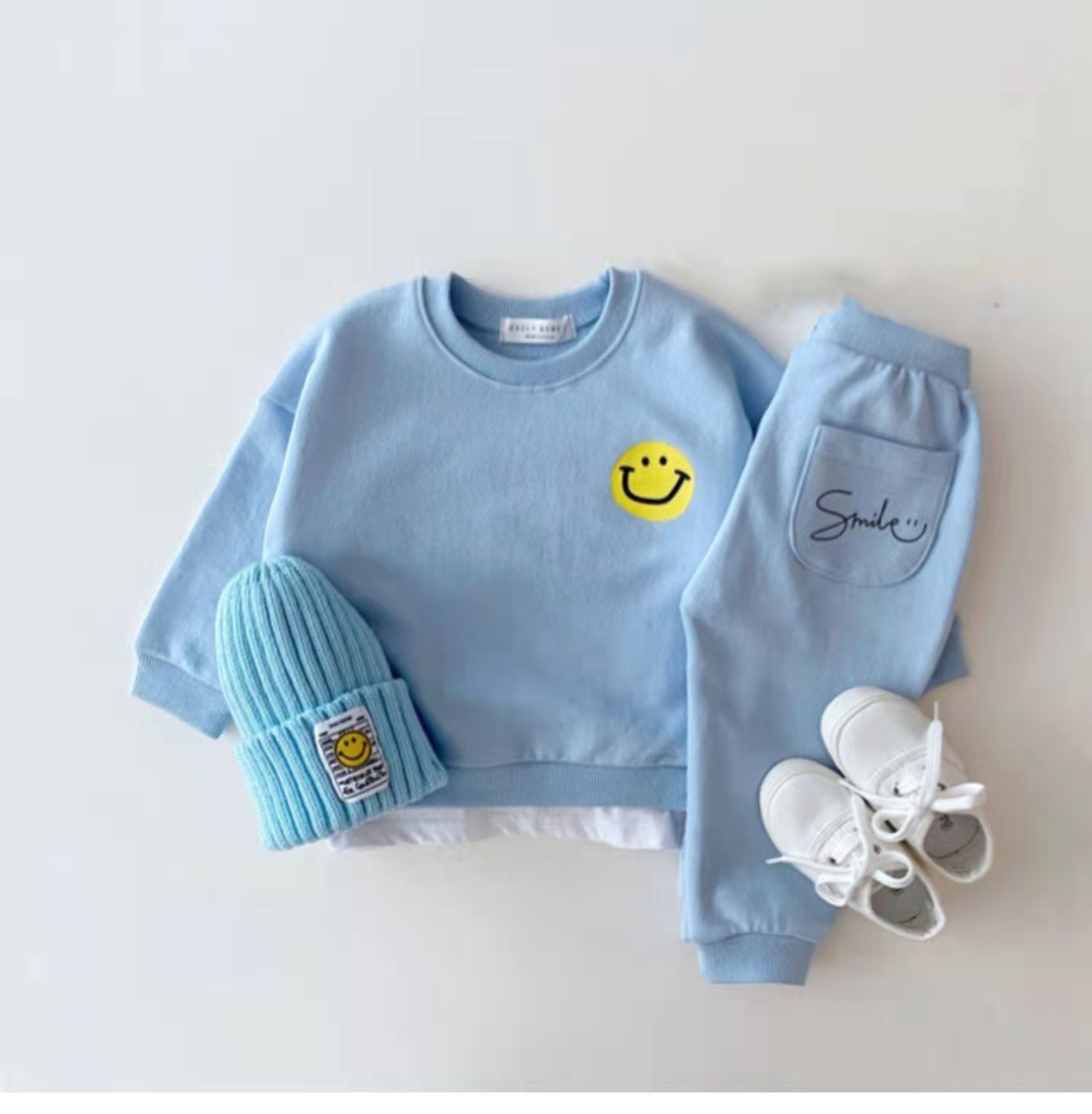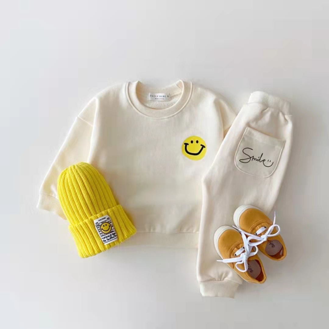 한국 아동복 봄과 가을 스마일 스포츠 스웨터 바지 소년 소녀 아기 캐주얼 편지 세트 트렌디한 투피스 세트