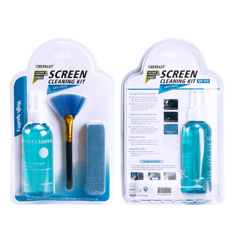 说明:本工厂通过ISO-9001质量体系认证,本品是热压三件套;包装盒子有中文和英文两种,订购时如需要中文或者英文,请提前和客服沟通,否则将承机发货;三件套具体内容为,清洁剂+清洁刷+擦拭布。本品通过MSDS和SGS质量检测认证.可接受OEM订单,印LOGO.一箱120套