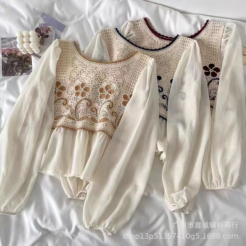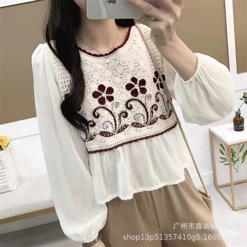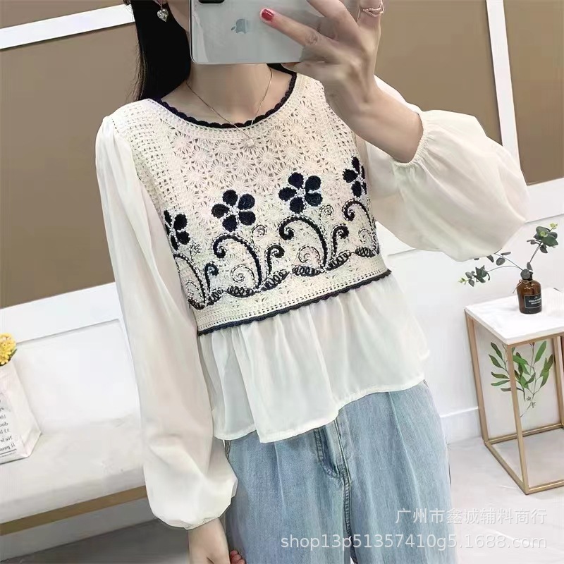 한국식 프렌치 크로 셰 뜨개질 컷 아웃 쉬폰 블라우스 부드러운 유행 틈새 스티칭 라운드 넥 달콤한 느슨한 긴팔 탑스토어 가기