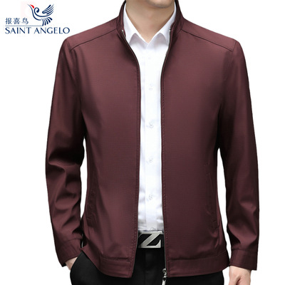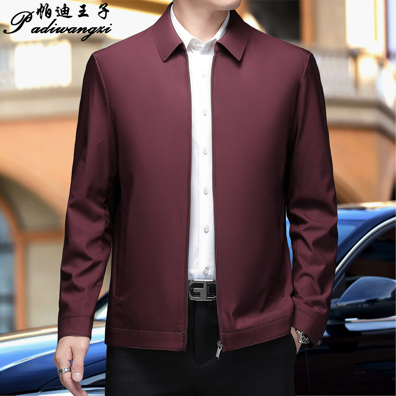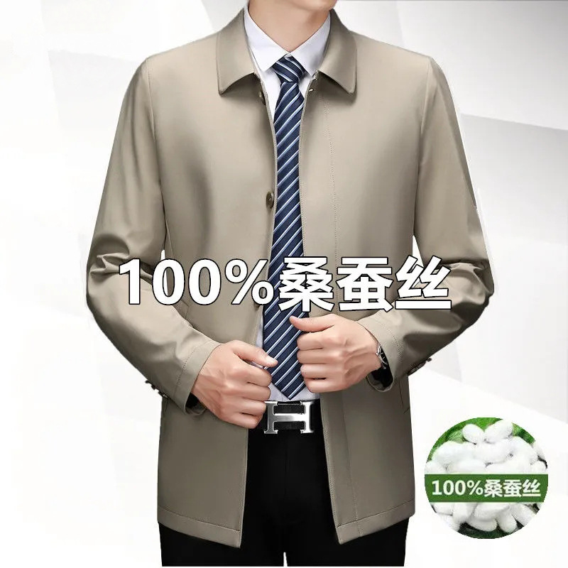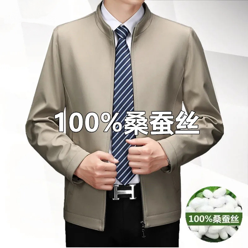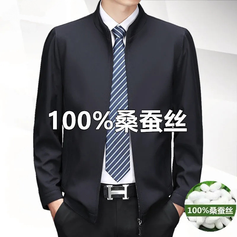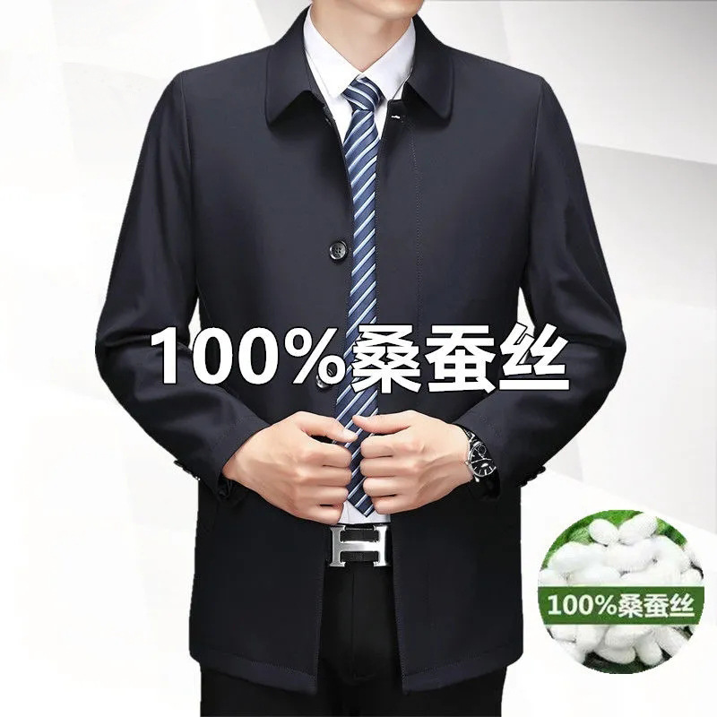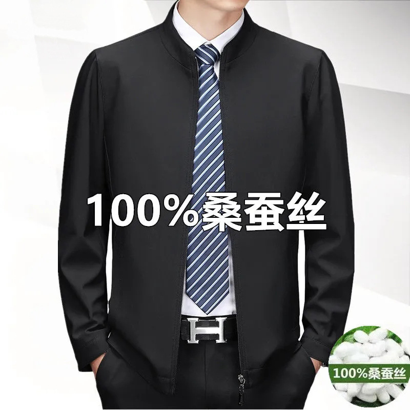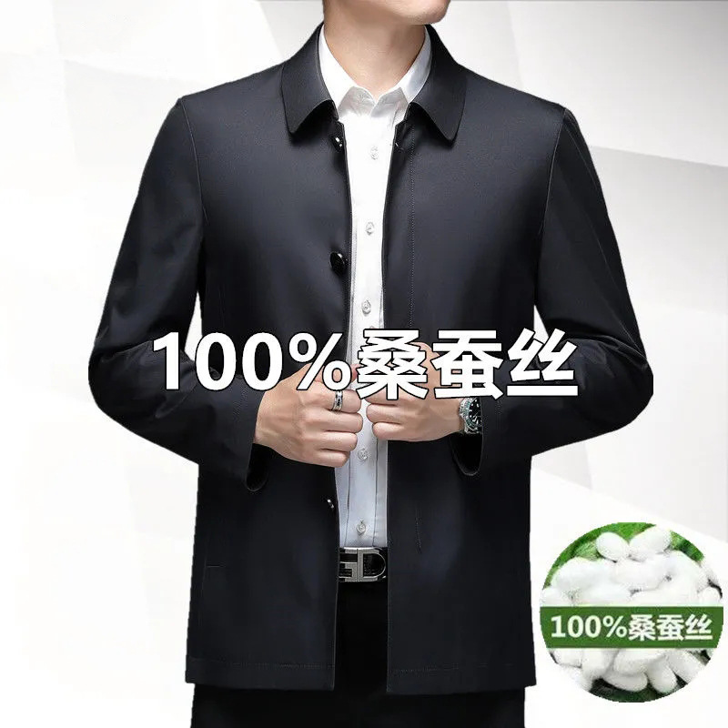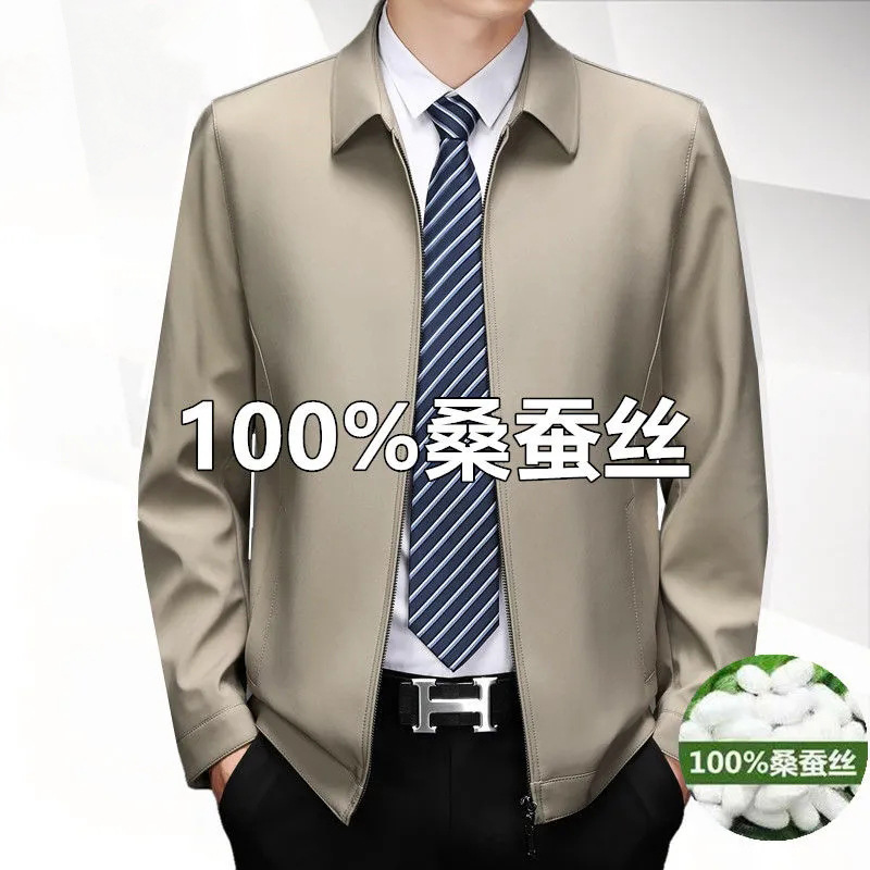 중년 남성 봄과 가을 옷깃 재킷 중년 및 노인 아빠는 뽕나무 실크 재킷 남성 비즈니스 캐주얼 얇은 탑을 착용합니다.