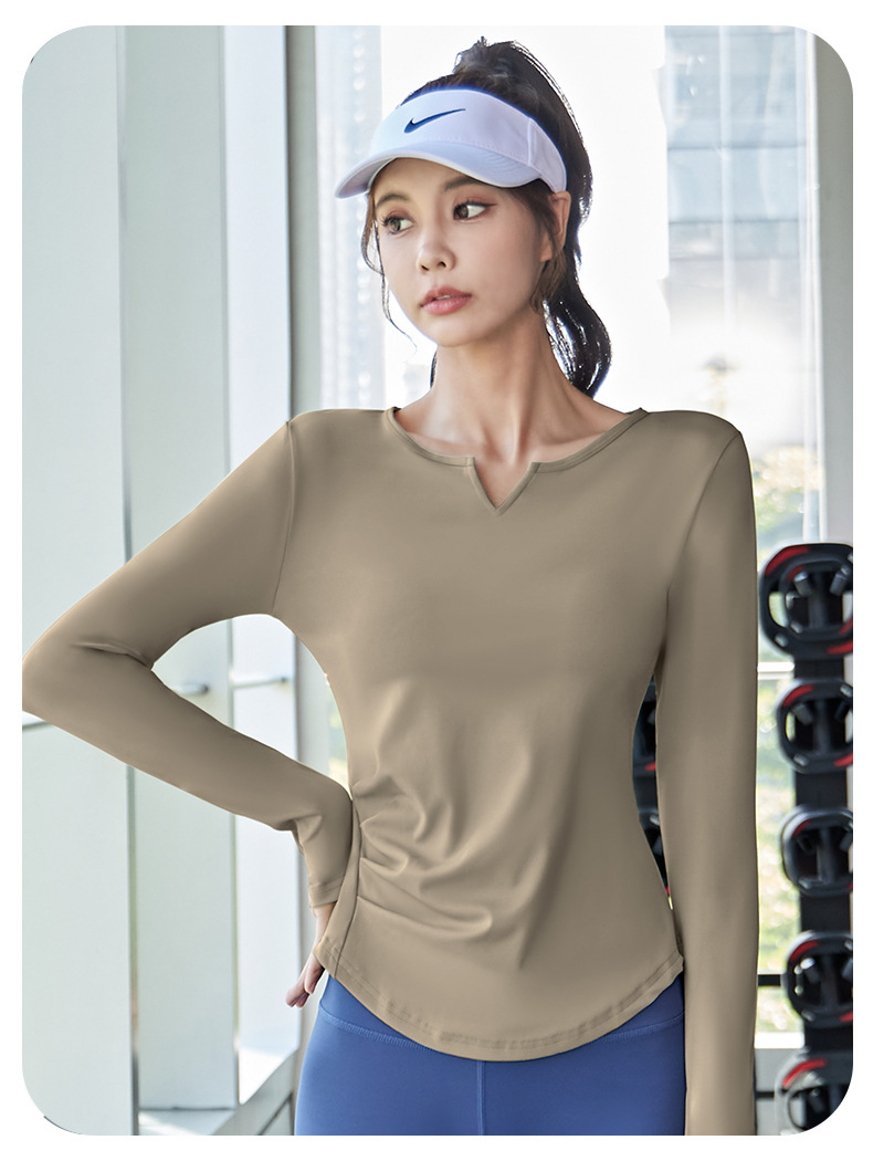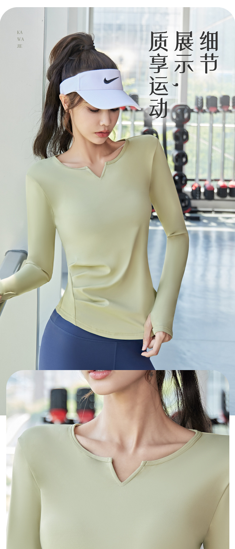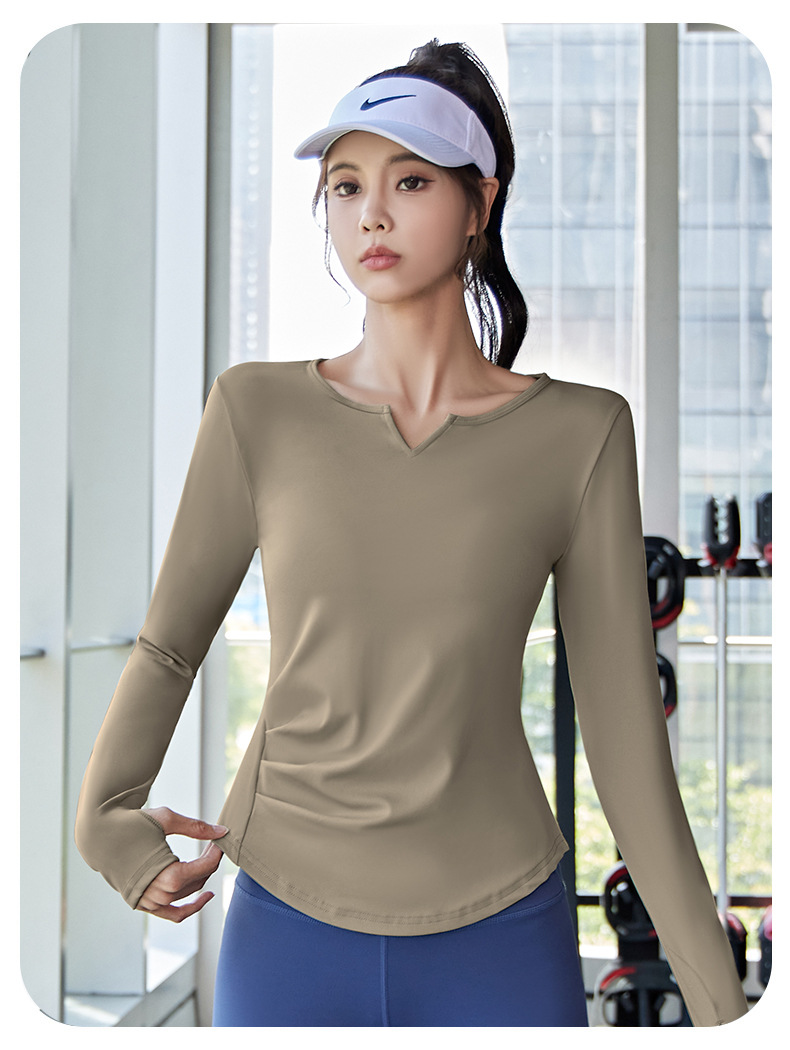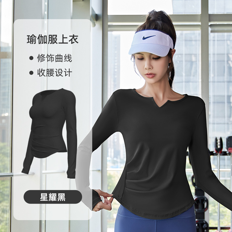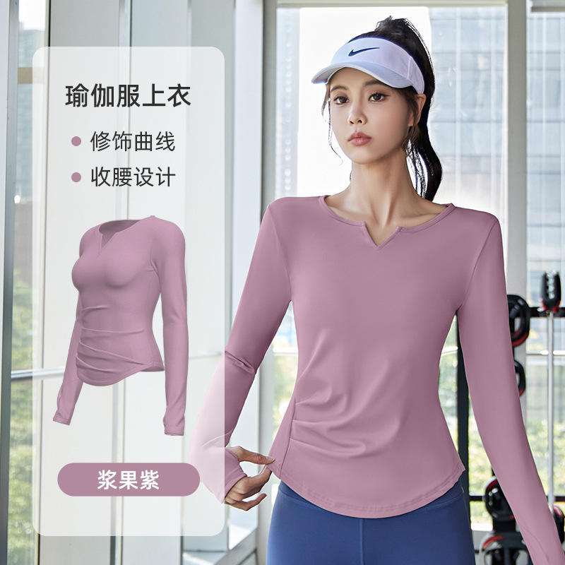 주이탕 단색 브이넥 주름 스포츠 긴팔 허리 슬림 요가복 여성 타이트 요가 탑