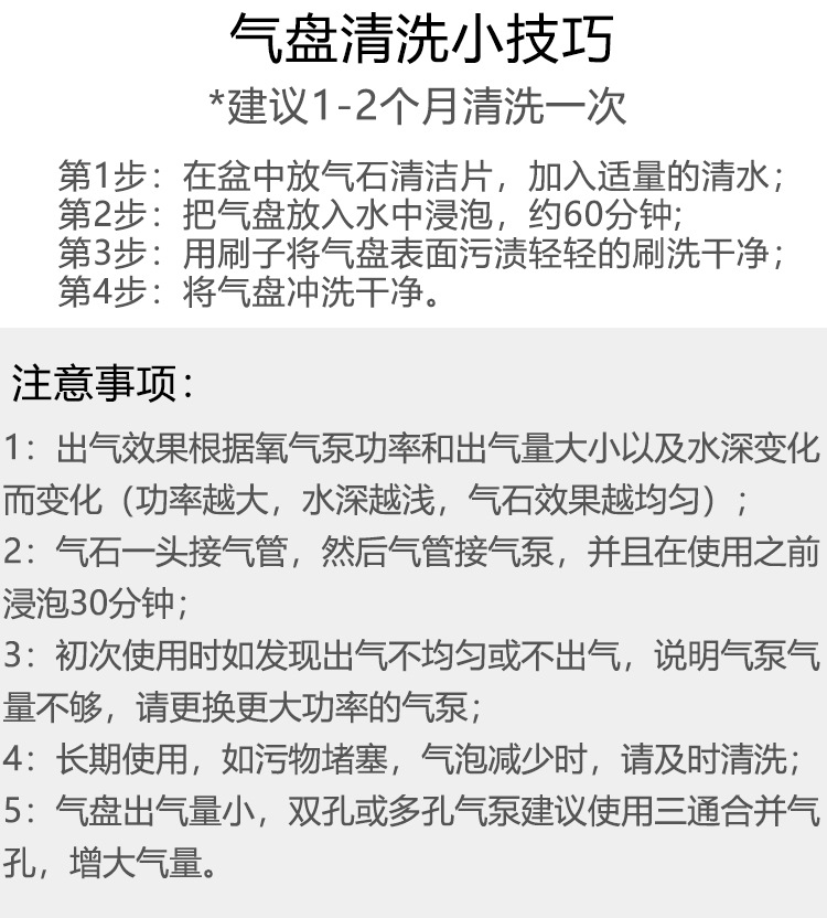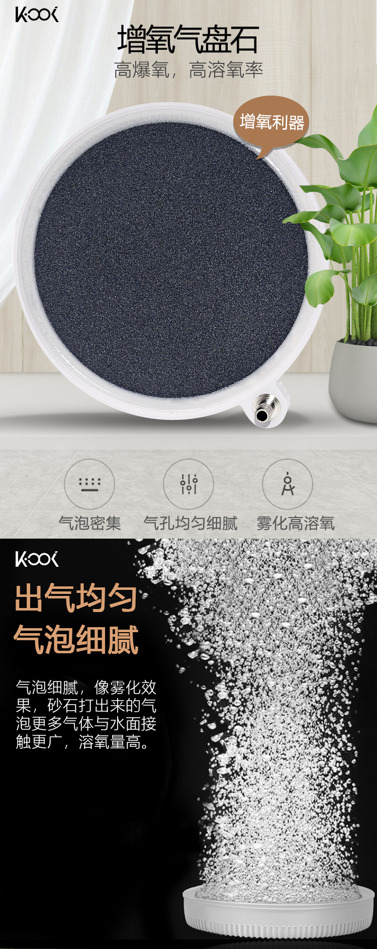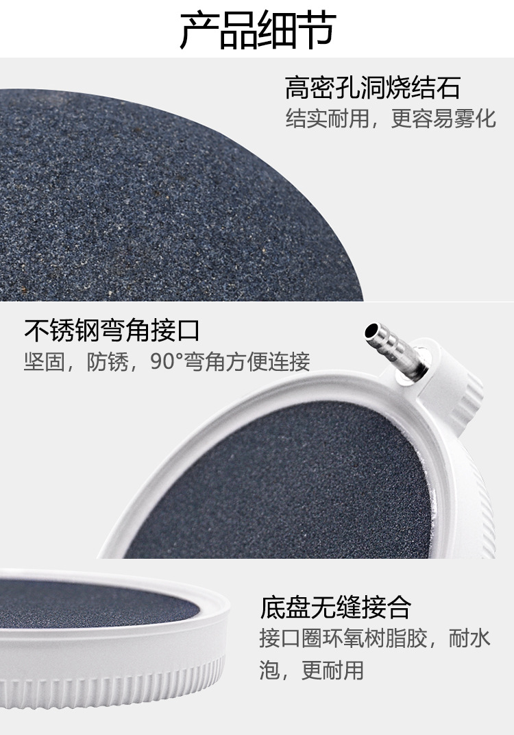 1.一体式设计,更美观;采用独家调配密封胶,气盘一体包边防漏气;直角设计,鱼缸防碰撞,出气更顺畅。