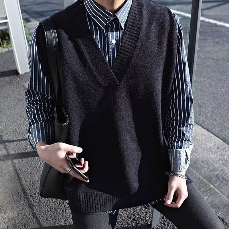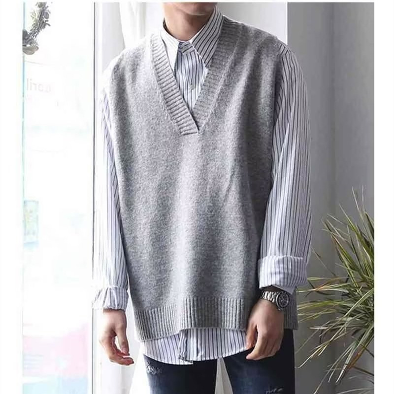 여성용 조끼 재킷 남성용 한국 스타일 특색 홍콩 스타일 V-넥 스웨터 조끼 느슨한 게으른 단색 니트 조끼 가을과 겨울