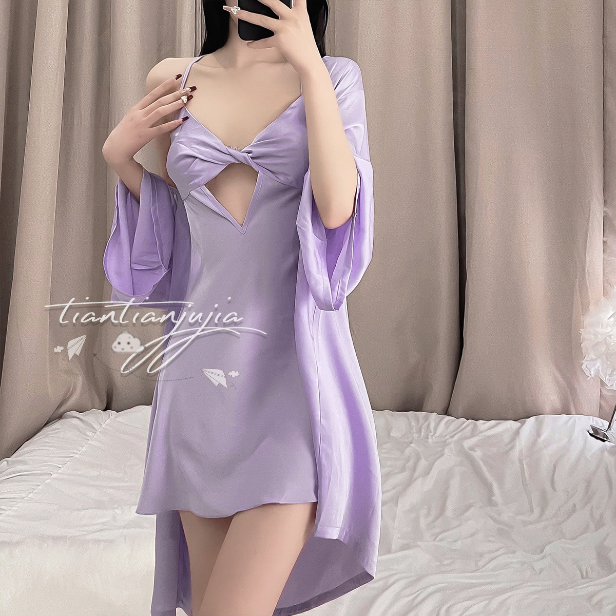 여성을위한 섹시한 잠옷 아이스 리본 유방 패드 얇은 2025 새로운 순수한 욕망 하이 엔드 유혹 서스펜더 잠옷 투피스 세트스토어 가기