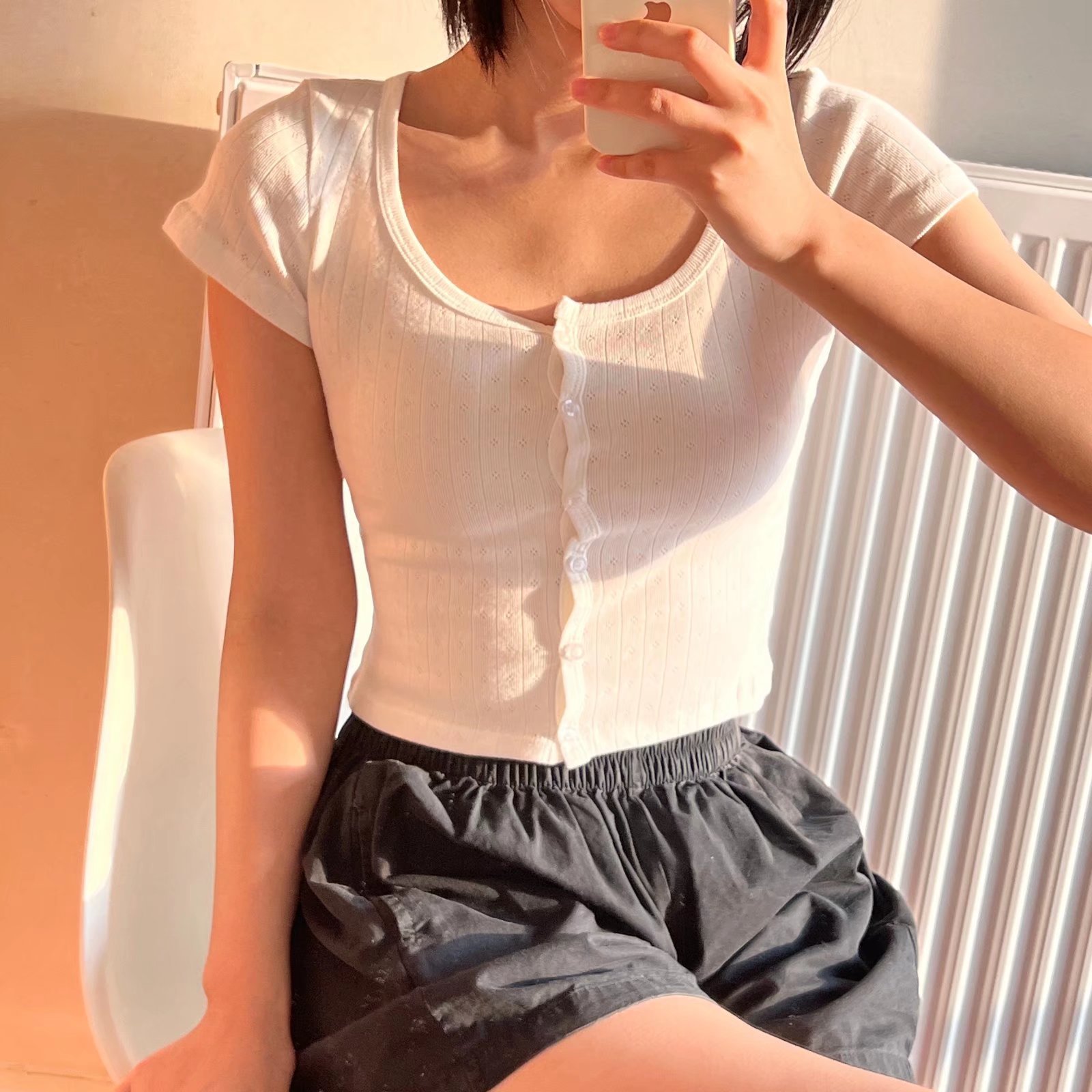 BM 스타일 브랜디 여름 버튼 짧은 섹시한 꽃 카디건 티셔츠 슬림 반팔 탑 여성의 순수한 욕망