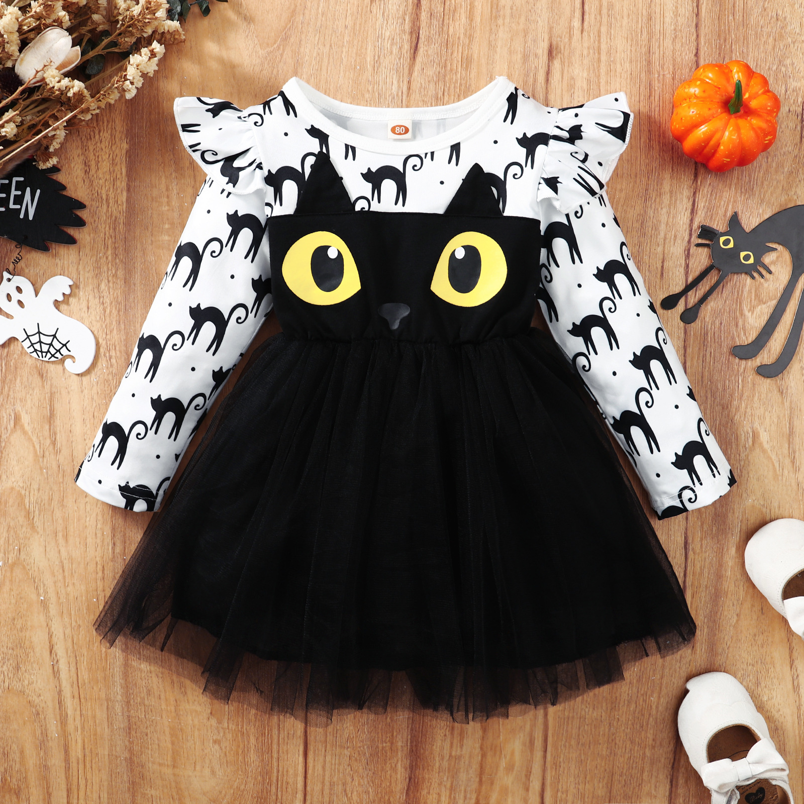중소형 소녀를위한 INS 대외 무역 플랫폼 할로윈 2 색 긴 소매 메쉬 눈 인쇄 원피스 대외 무역 도매스토어 가기