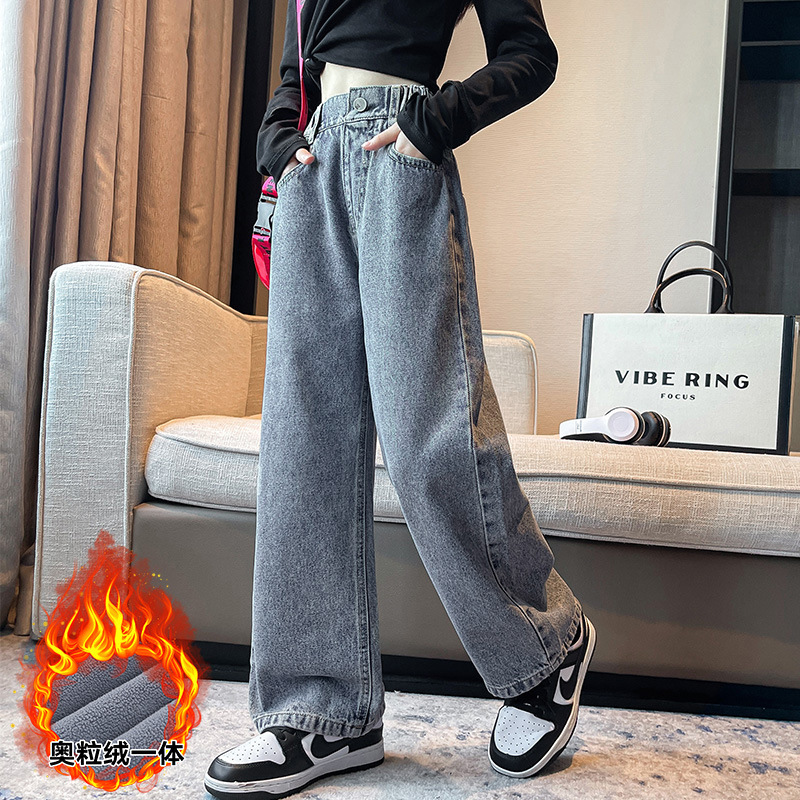 여아 청바지 2024 봄, 가을 새로운 스타일의 와이드 팬츠, 중대형 아동용 루즈하고 슬림한 벨벳 스트레이트 팬츠스토어 가기