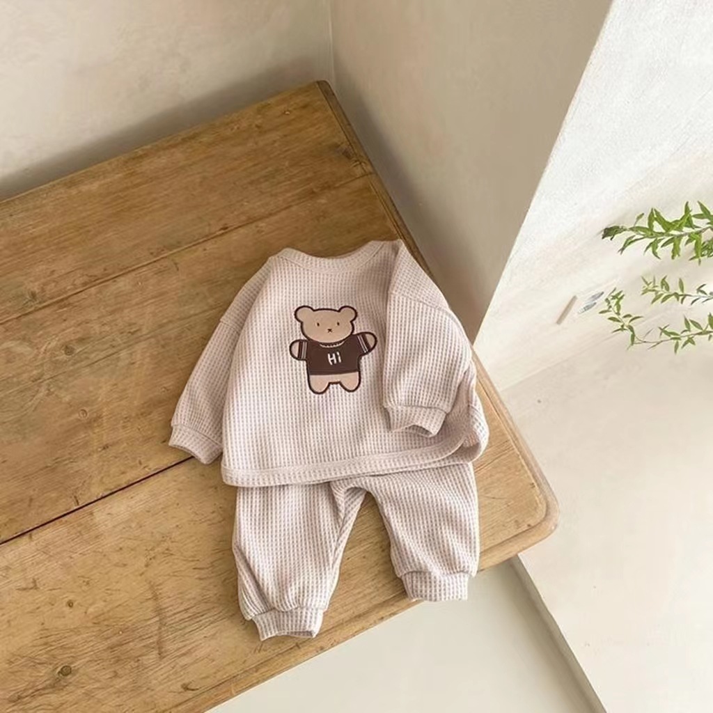 한국 스타일 가을 새로운 유아 아기 만화 와플 티셔츠 + 바지 복고풍스토어 가기
