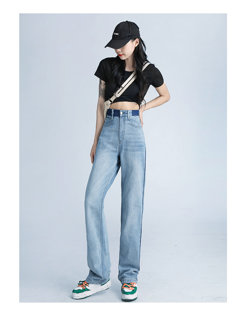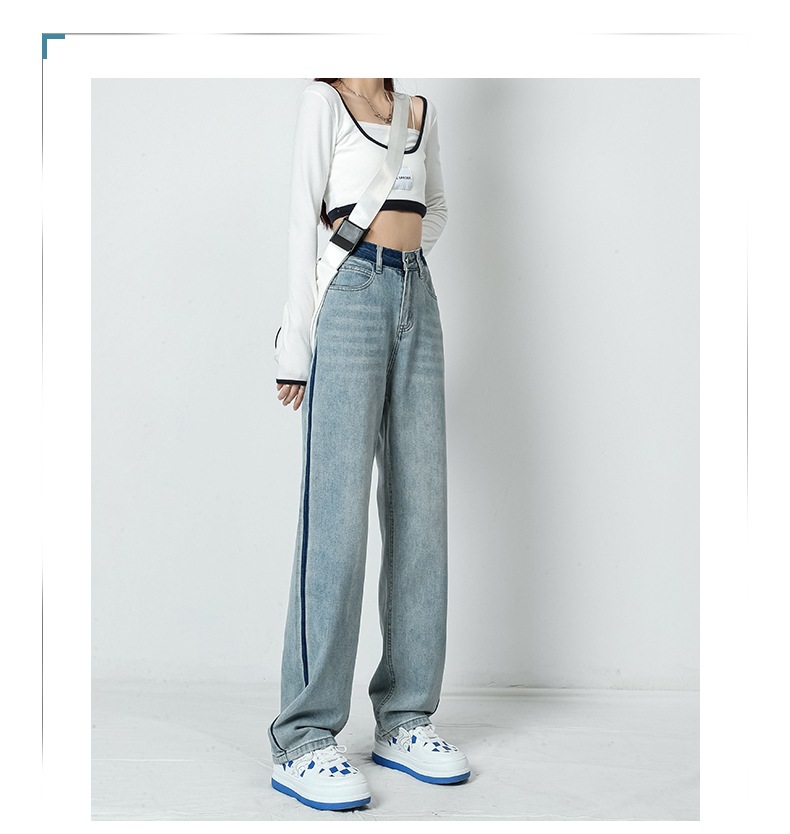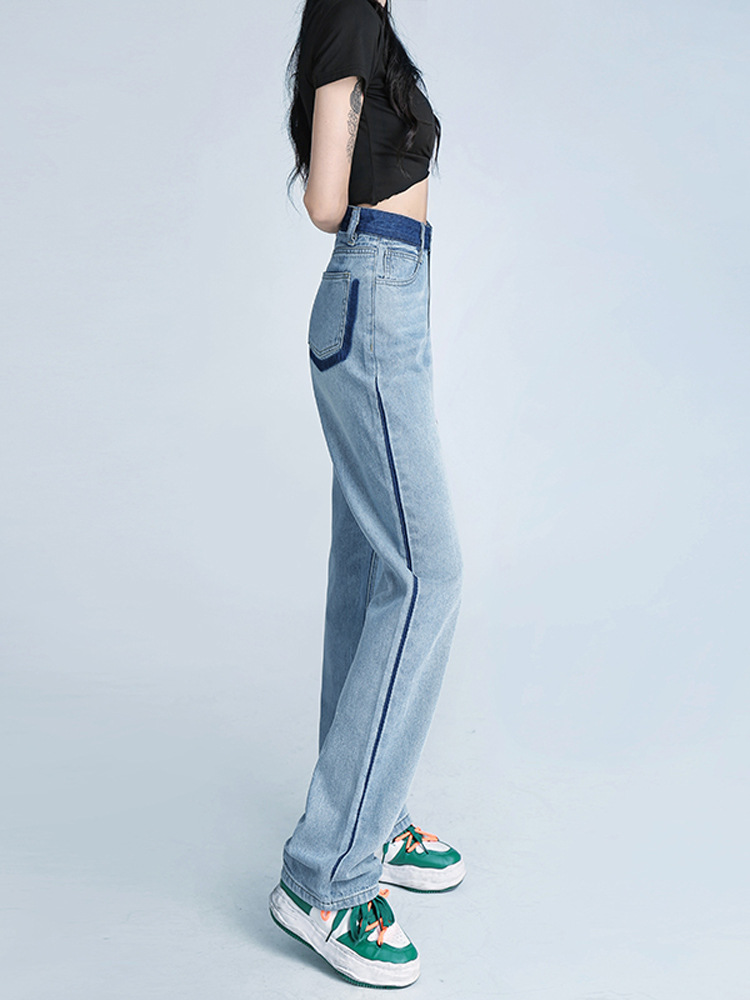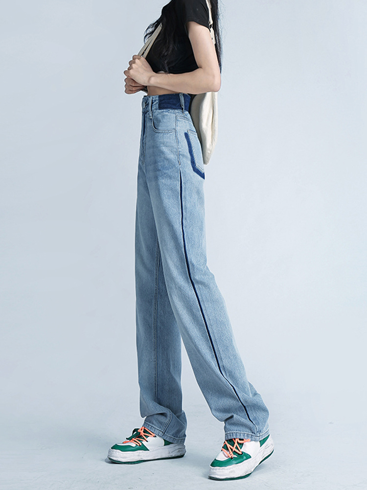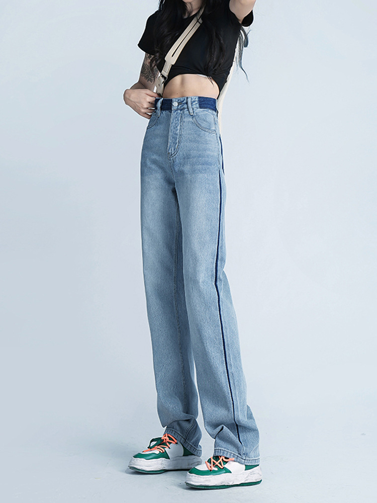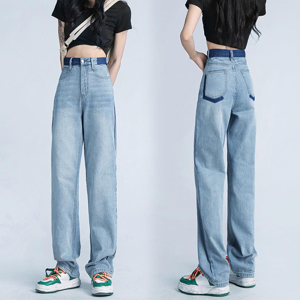 얇은 라이트 컬러 디자인 센스 스트레이트 레그 청바지 여성용 2022 여름 새로운 컬러 블록 하이 웨이스트 슬림핏 와이드 레그 팬츠스토어 가기