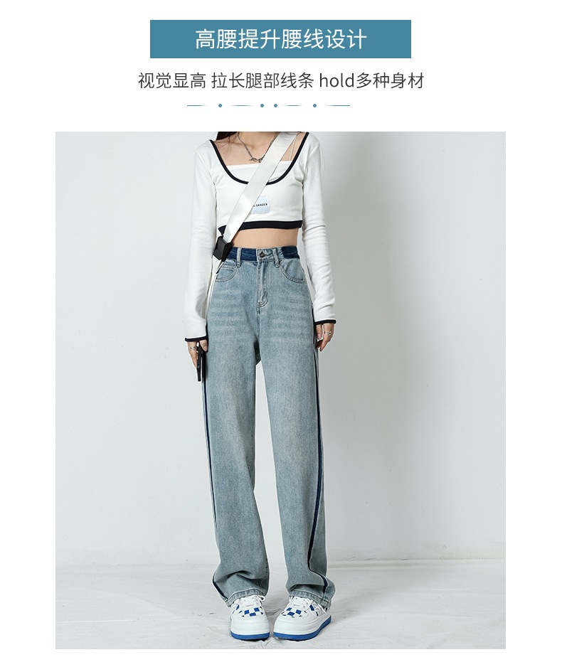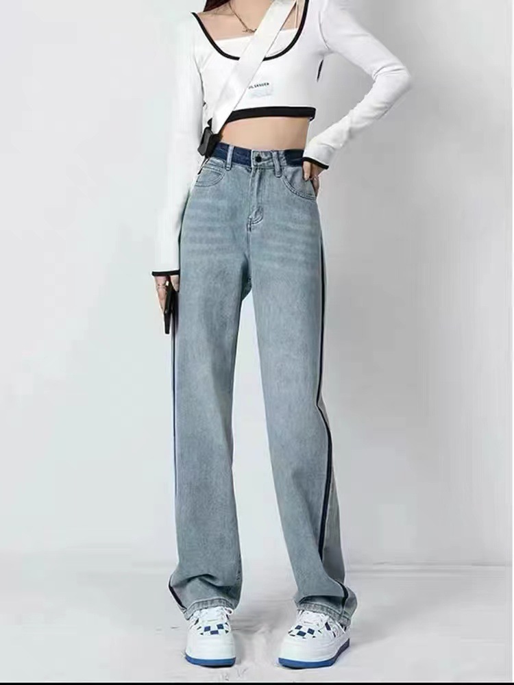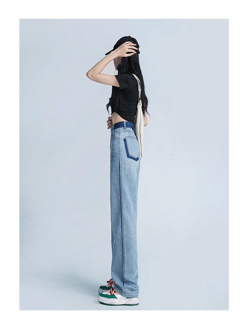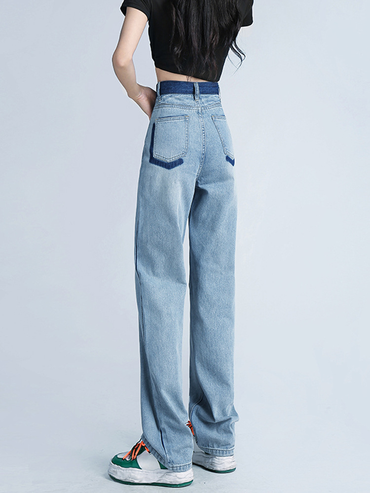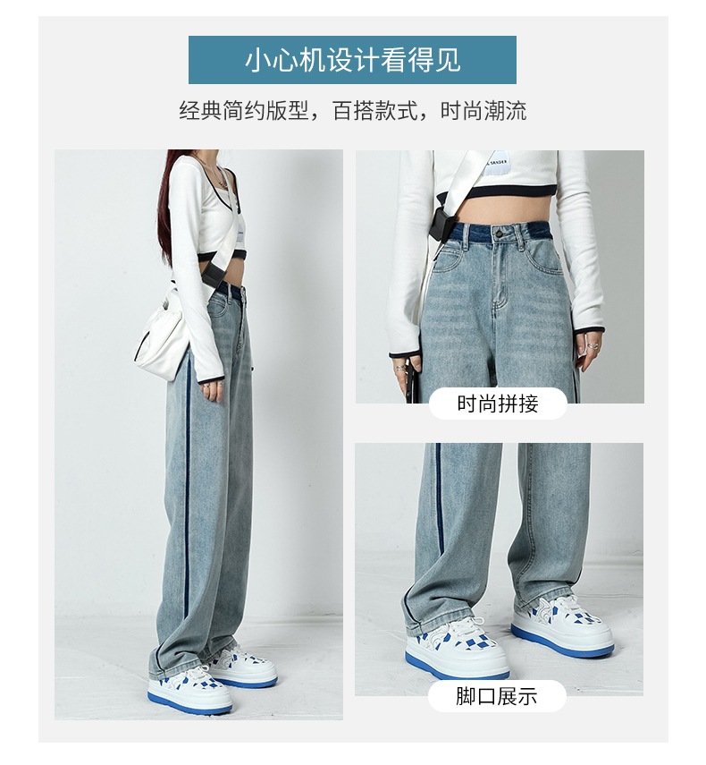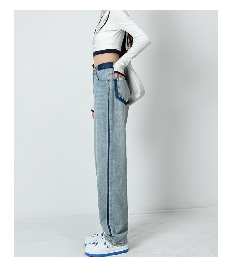 얇은 라이트 컬러 디자인 센스 스트레이트 레그 청바지 여성용 2022 여름 새로운 컬러 블록 하이 웨이스트 슬림핏 와이드 레그 팬츠스토어 가기
