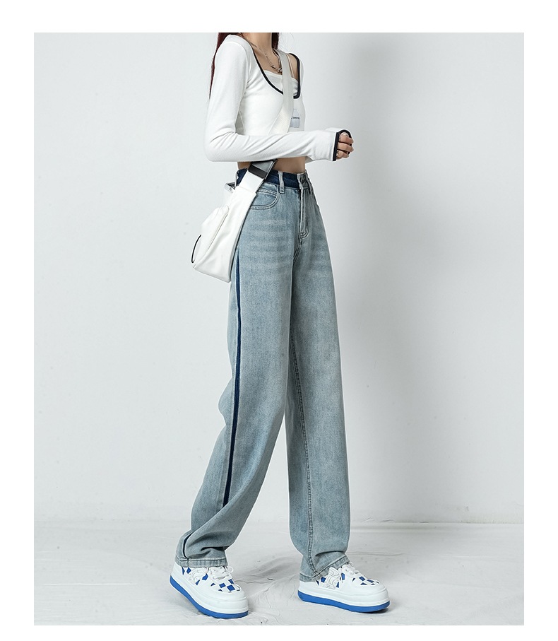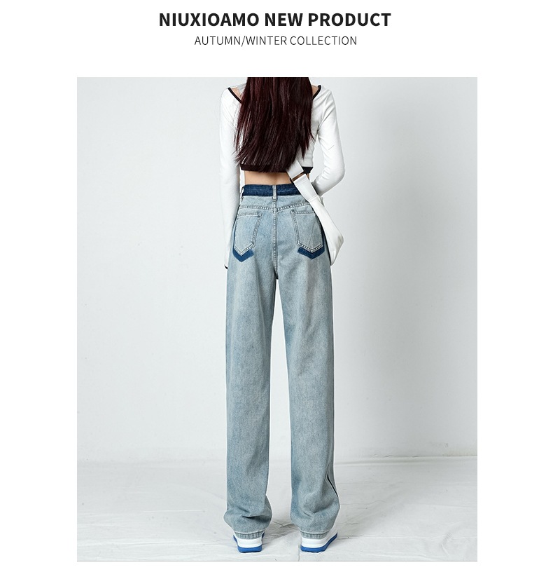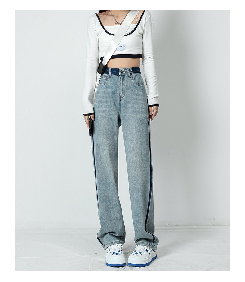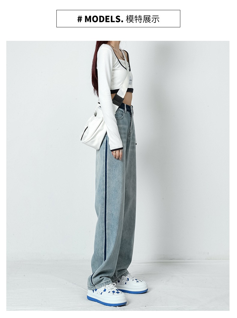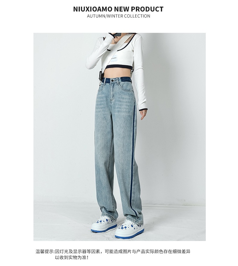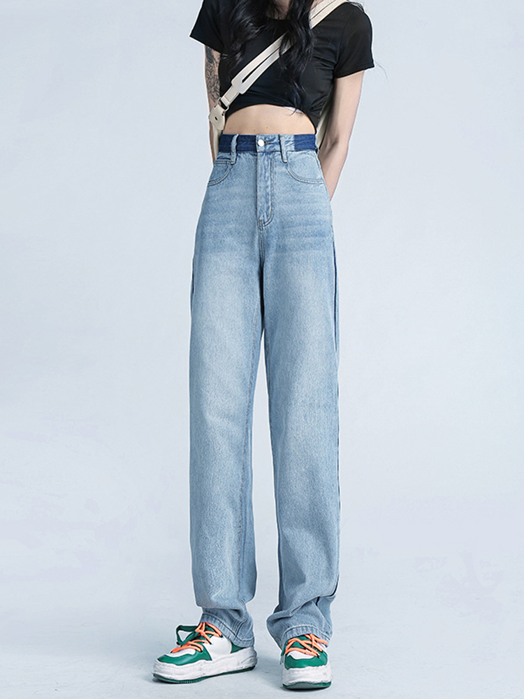 얇은 라이트 컬러 디자인 센스 스트레이트 레그 청바지 여성용 2022 여름 새로운 컬러 블록 하이 웨이스트 슬림핏 와이드 레그 팬츠스토어 가기