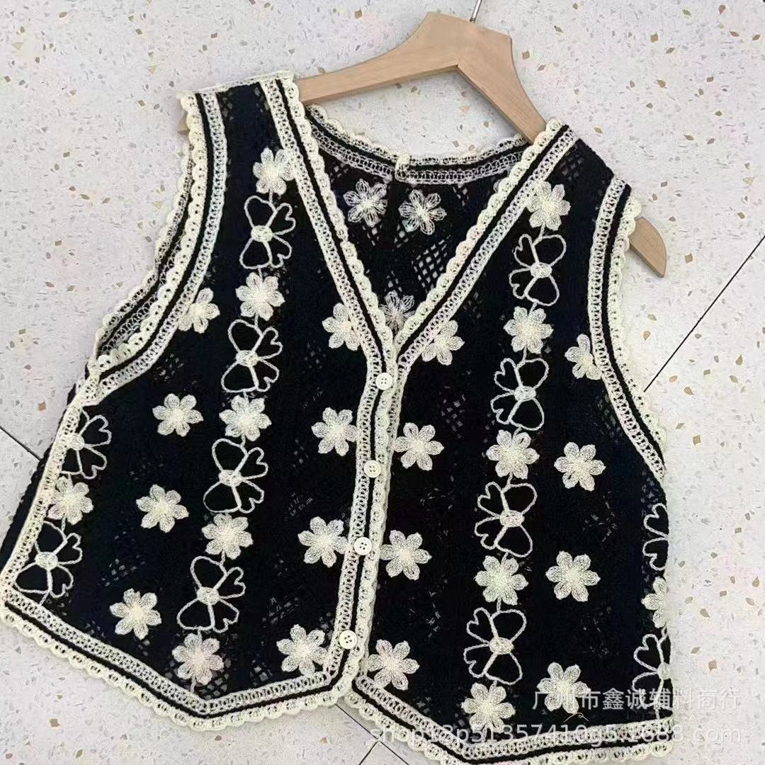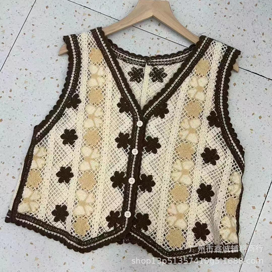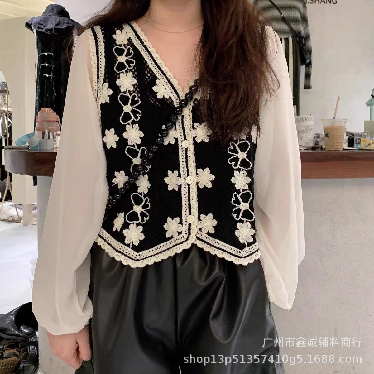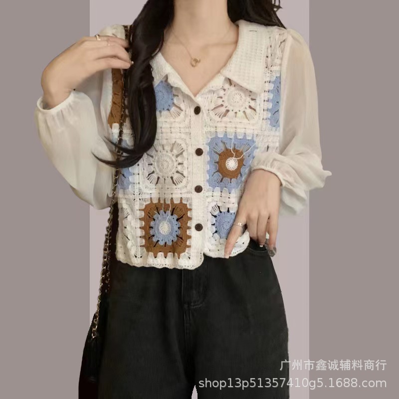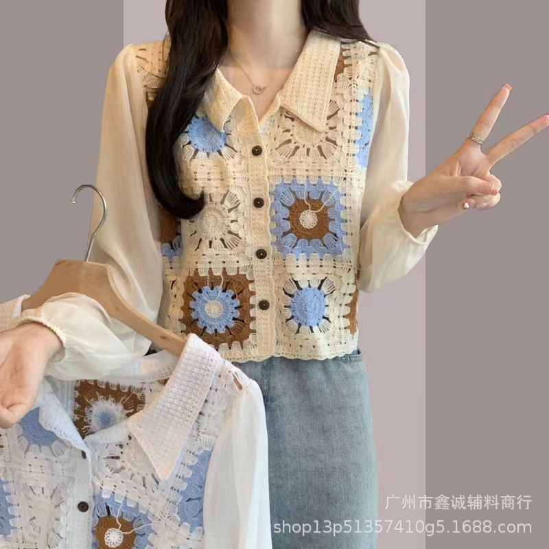 부드러운 스타일 우아한 V-넥 이른 가을 빈티지 중공 크로 셰 뜨개질 스티칭 쉬폰 셔츠 세련된 느슨한 짧은 달콤한 탑