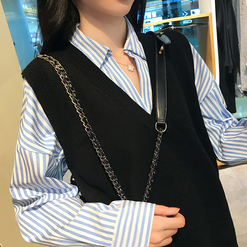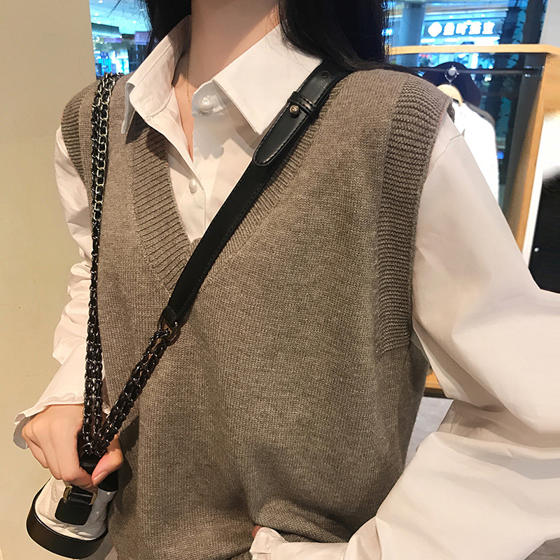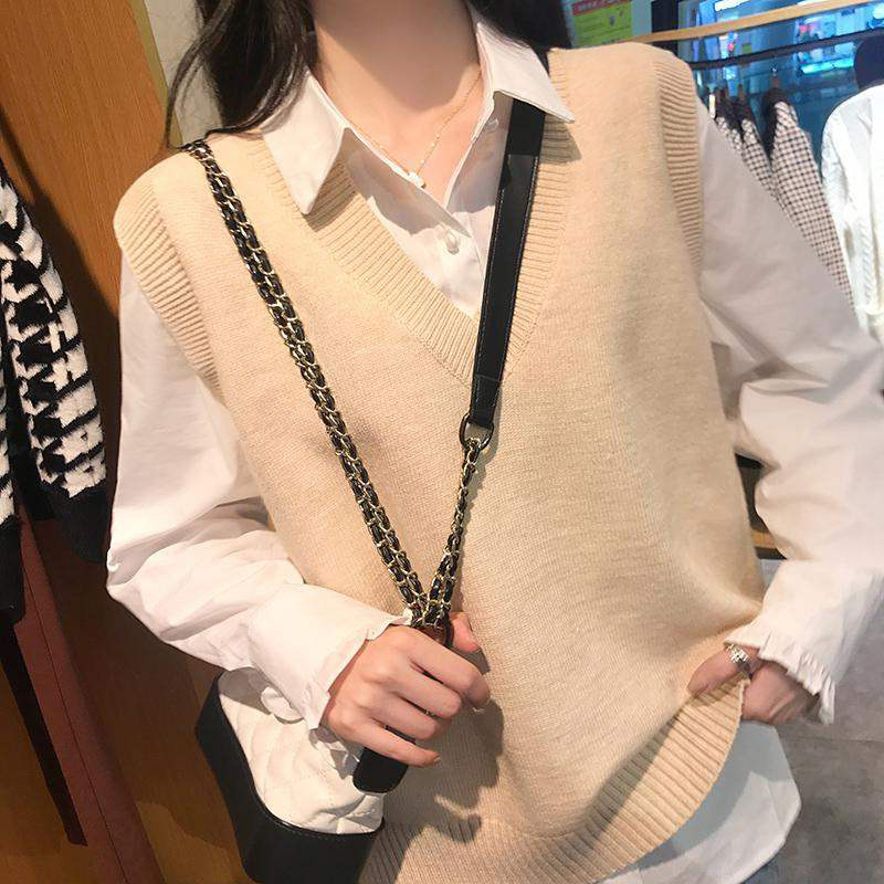 여자의 살구색 V-넥 니트 조끼 느슨한 한국 스타일 봄과 가을 겉옷 최고 민소매 조끼 유행 조끼스토어 가기