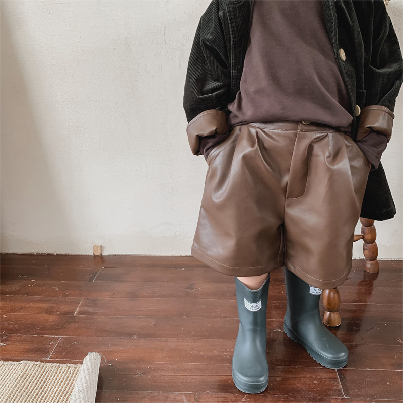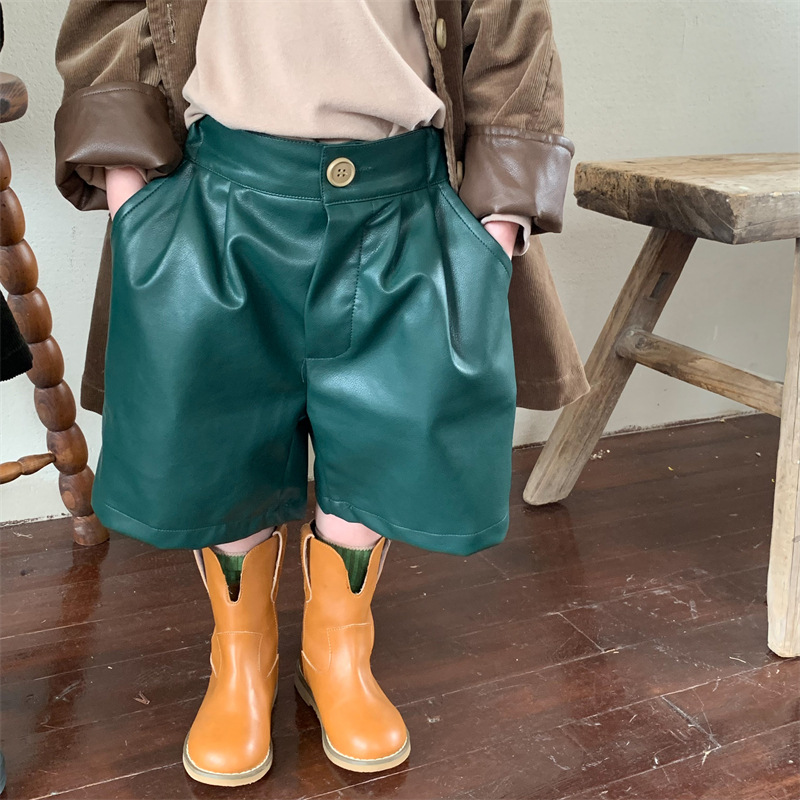 2024년 가을 신상품 아동용 단색 스타일리시 가죽바지 남녀 아기용 숲속풍 레트로 중간길이 바지 반바지