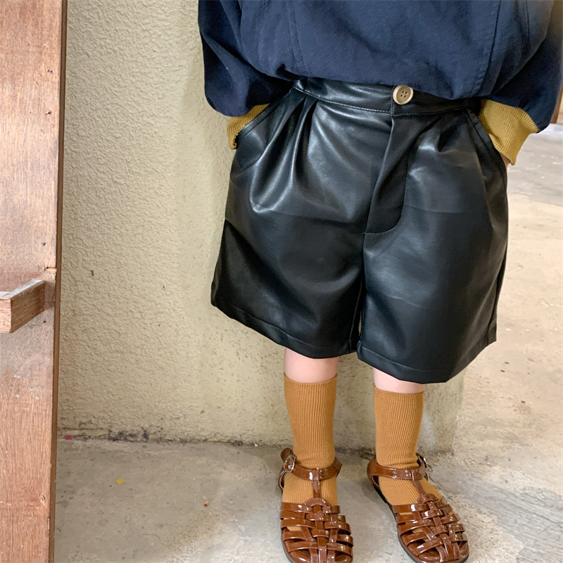 2024년 가을 신상품 아동용 단색 스타일리시 가죽바지 남녀 아기용 숲속풍 레트로 중간길이 바지 반바지스토어 가기