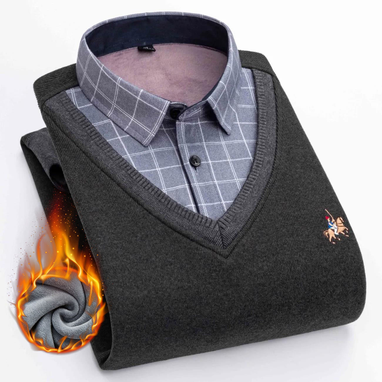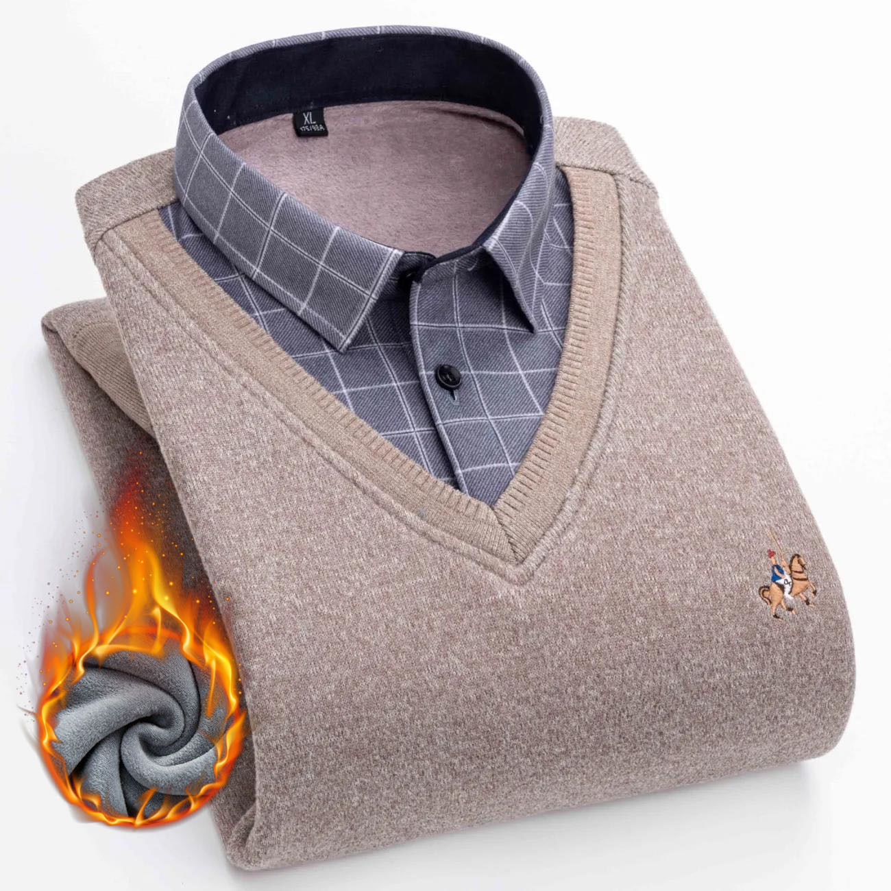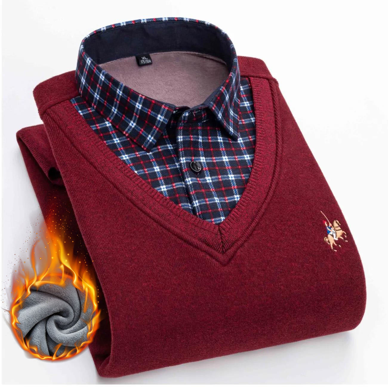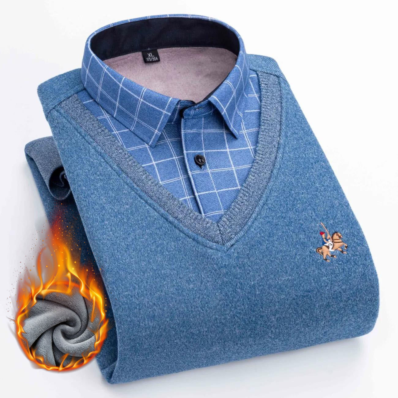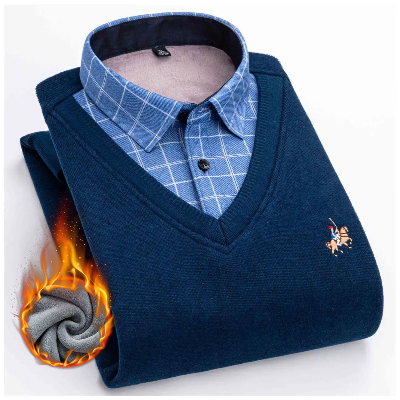 가을과 겨울 남자의 따뜻한 가짜 투피스 기모 두꺼운 셔츠 칼라 니트웨어 젊은 중년 스웨터 풀오버 모든 매치 탑