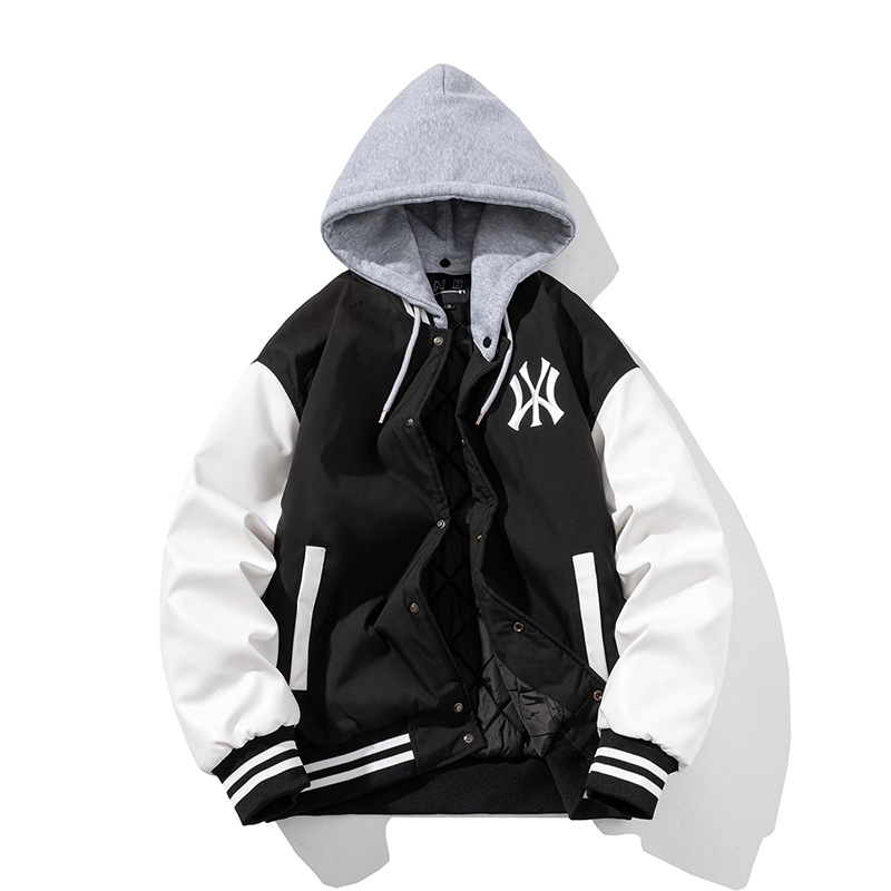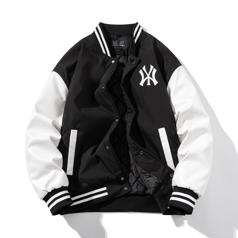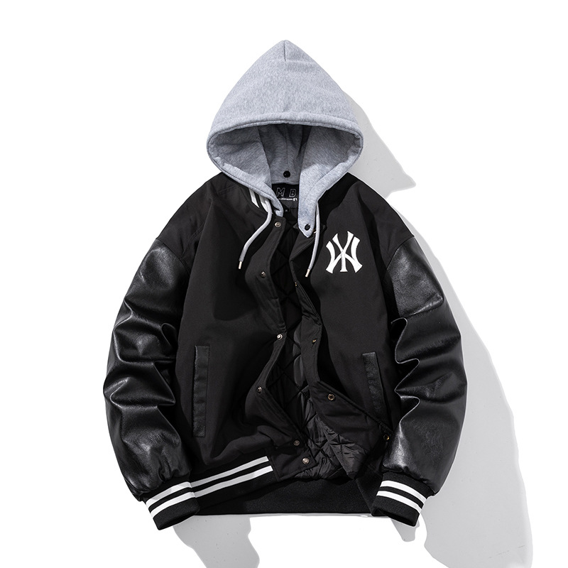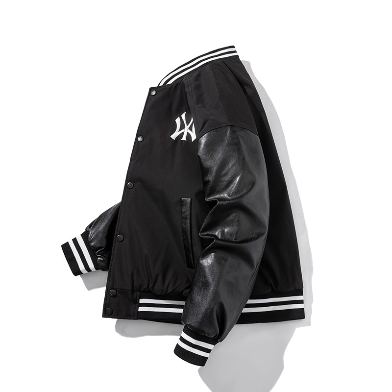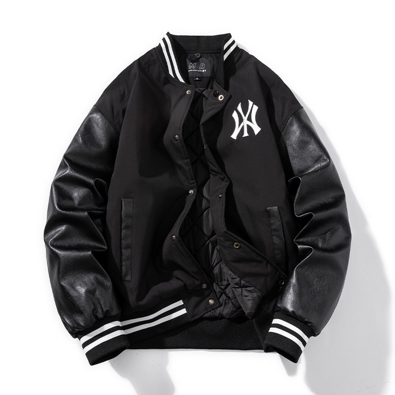 스티칭 콘트라스트 컬러 야구 세트 재킷 남자 미국 헤비급 바이커 세트 PU 가죽 자켓 오버 사이즈 폭격기 재킷스토어 가기