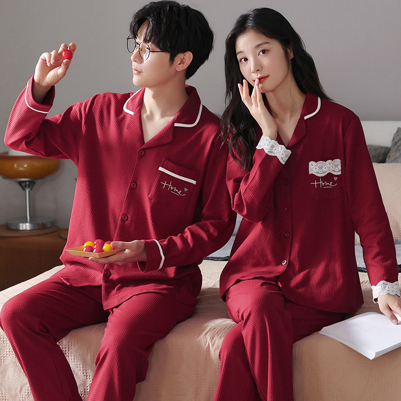 웨딩 잠옷 신혼 부부 순면 긴 소매 축제 버건디 여자 와가루 남자의 가정 옷 가을스토어 가기