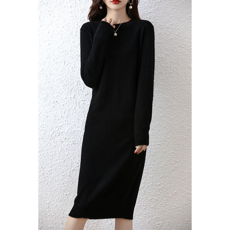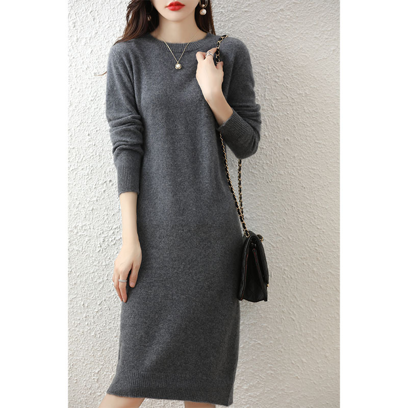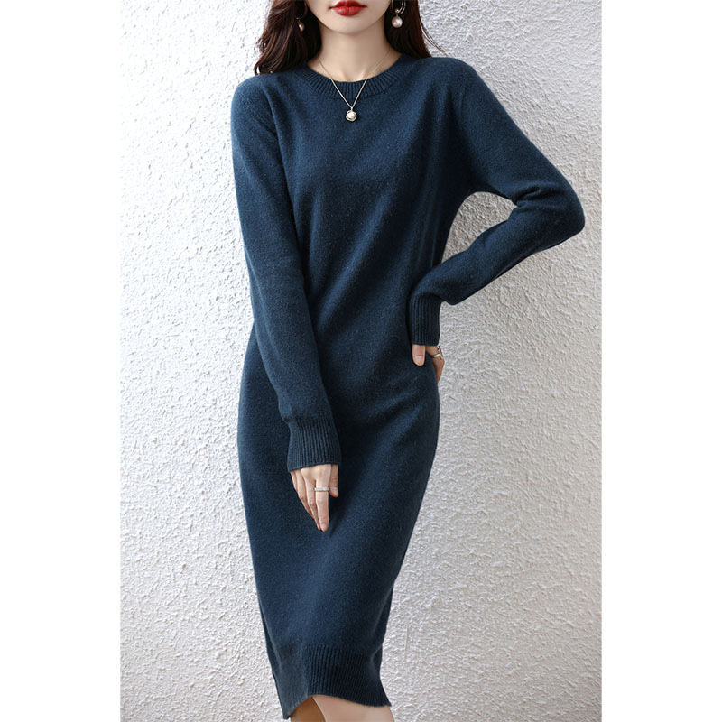 22 가을과 겨울 새로운 라운드 넥 100 퓨어 울 원피스 여성의 긴 무릎 스웨터 스커트 퓨어 울 베이스 셔츠