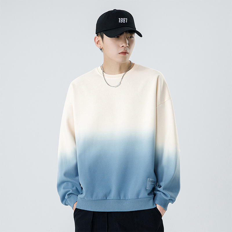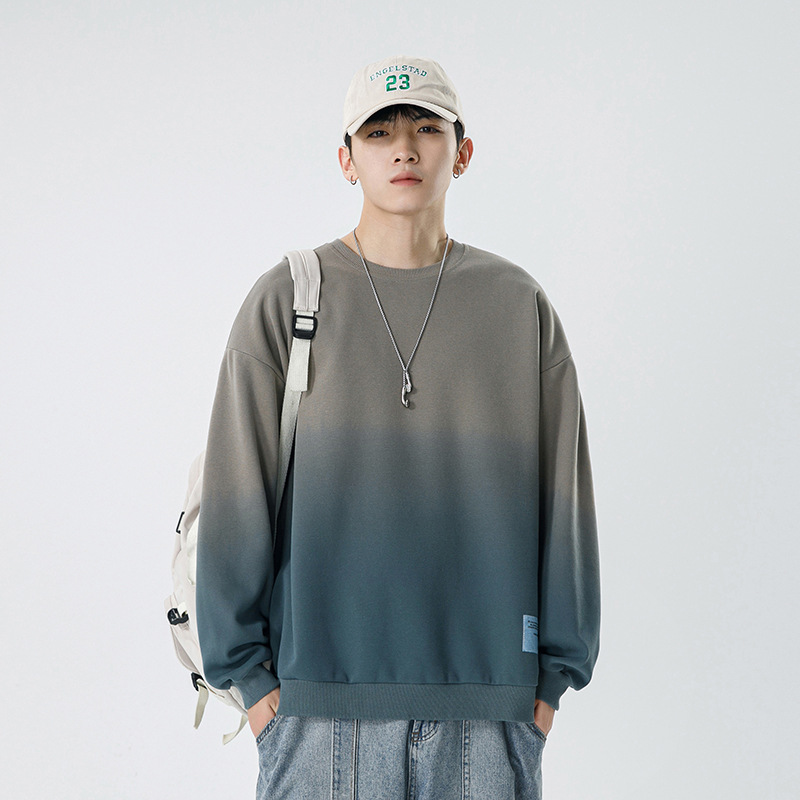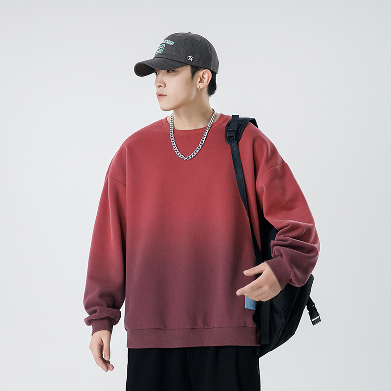 쿤하이펑윈 일본 스타일 남성용 단색 라운드넥 스웨트셔츠 남성용 초가을 루즈핏 트렌디 브랜드 염색 그라데이션 버건디 스웨트셔츠
