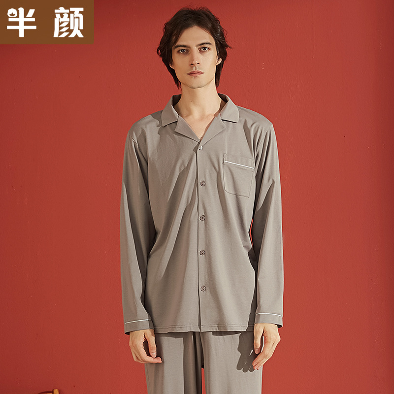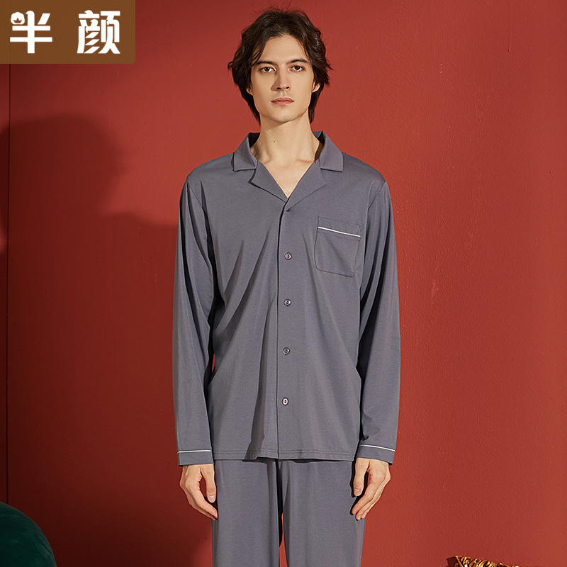 반 얀 가을 새로운 제인 유럽 스타일 남자의 옷깃 단색 편안한 Lanjing 모달 면 플러스 사이즈 잠옷 가정 옷스토어 가기