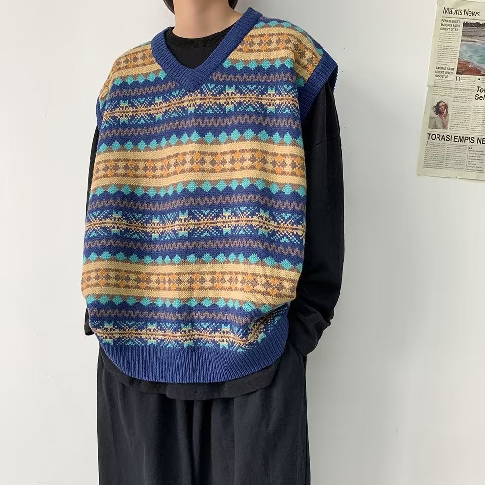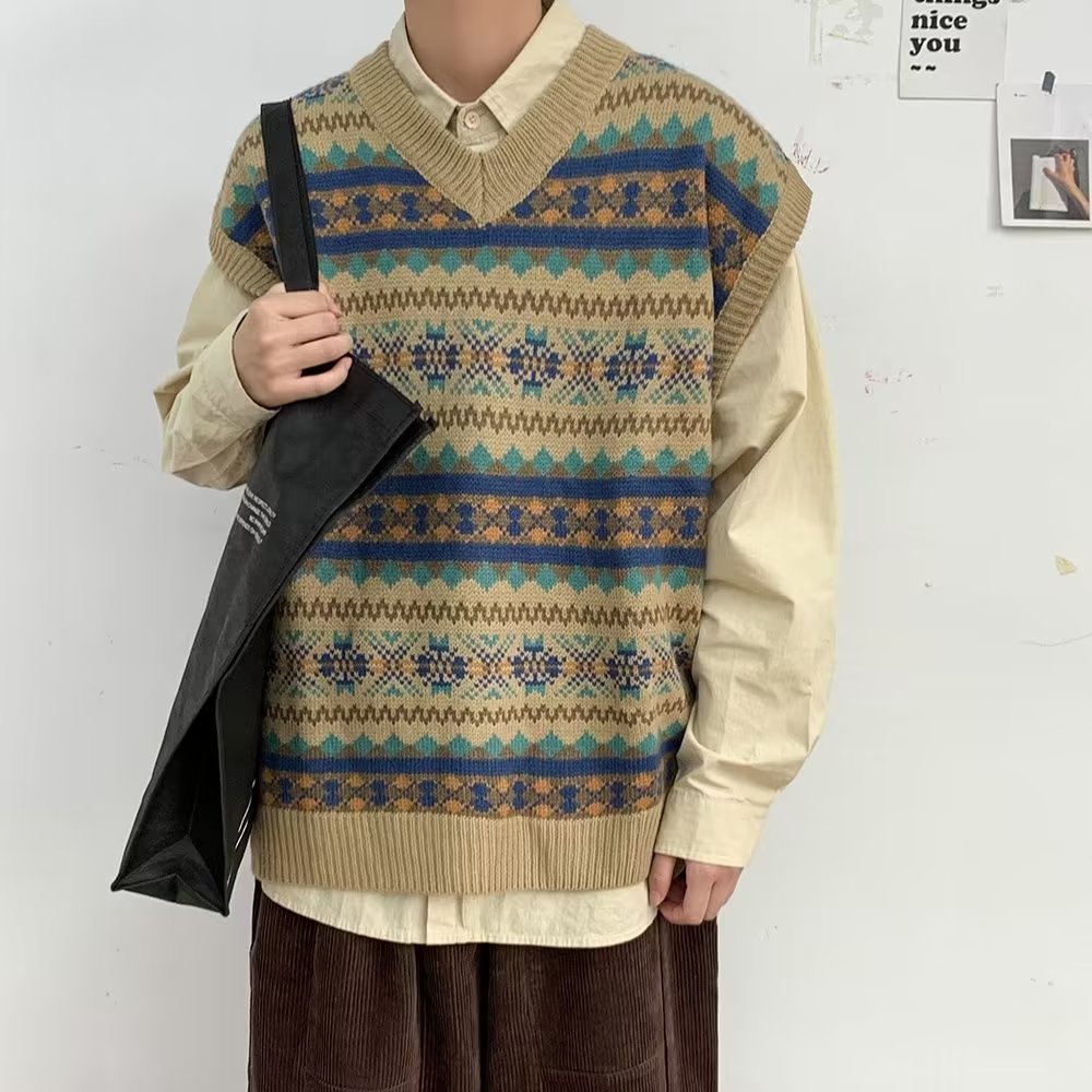 일본 복고풍 니트 조끼 남성과 여성의 트렌디 한 브랜드 에스닉 스타일 느슨한 트렌디 한 조끼 아웃웨어 V-넥 스웨터 조끼스토어 가기