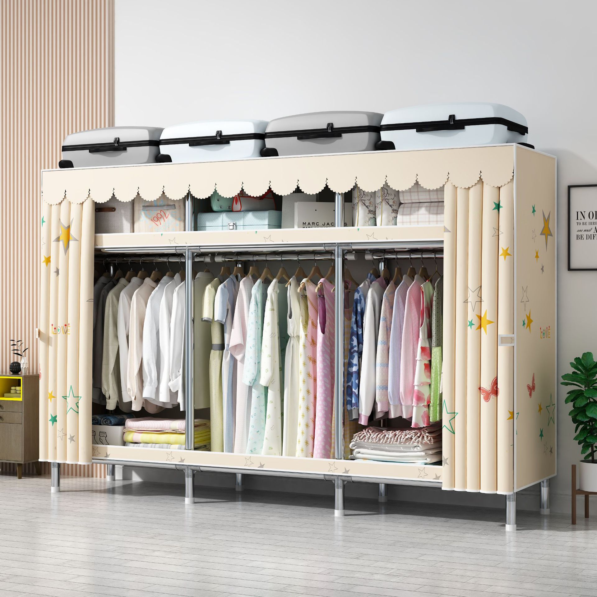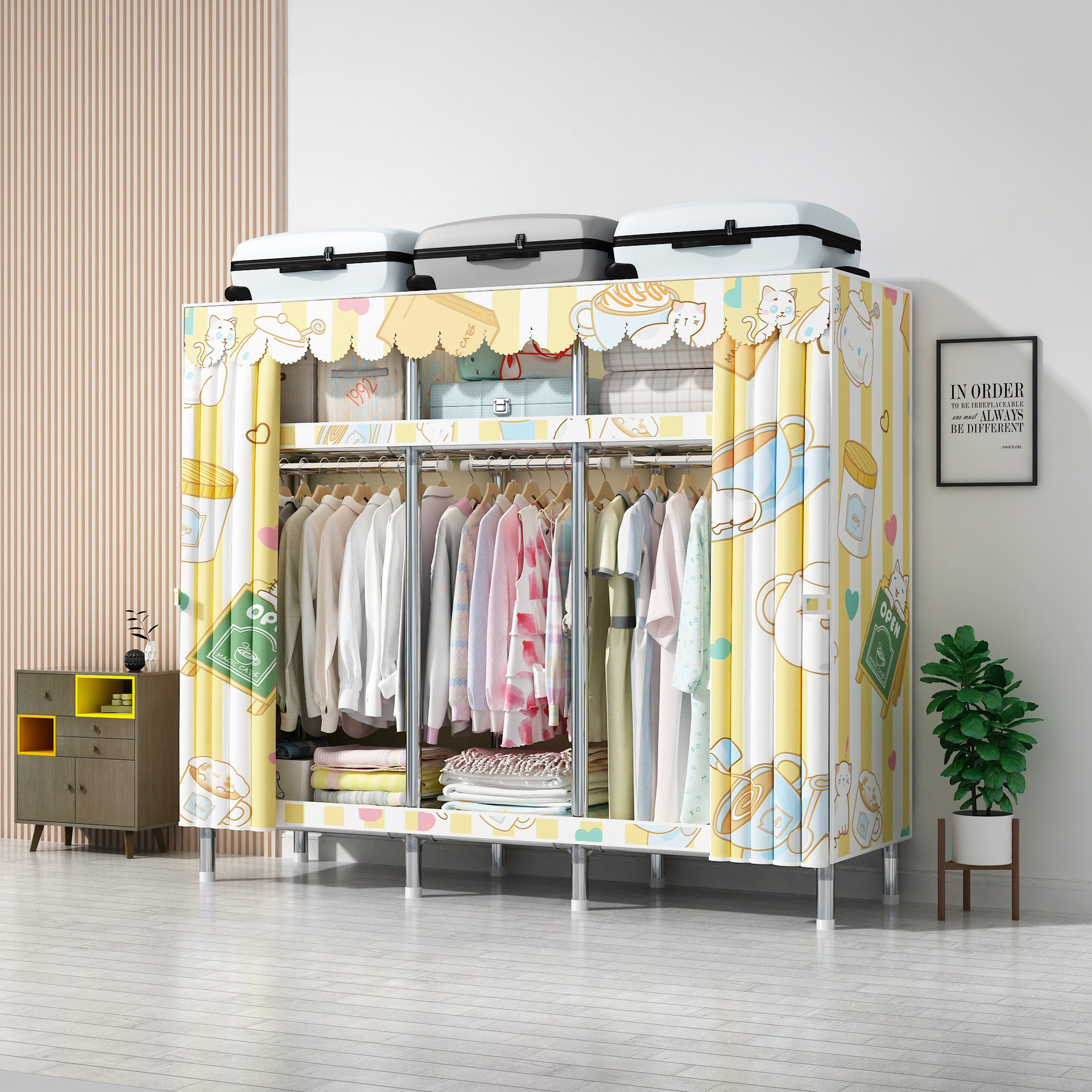 맞춤형 강철 파이프 천 옷장 임대 방을위한 간단한 옷장 강력하고 튼튼한 강철 파이프 프레임 옷장 홈 침실