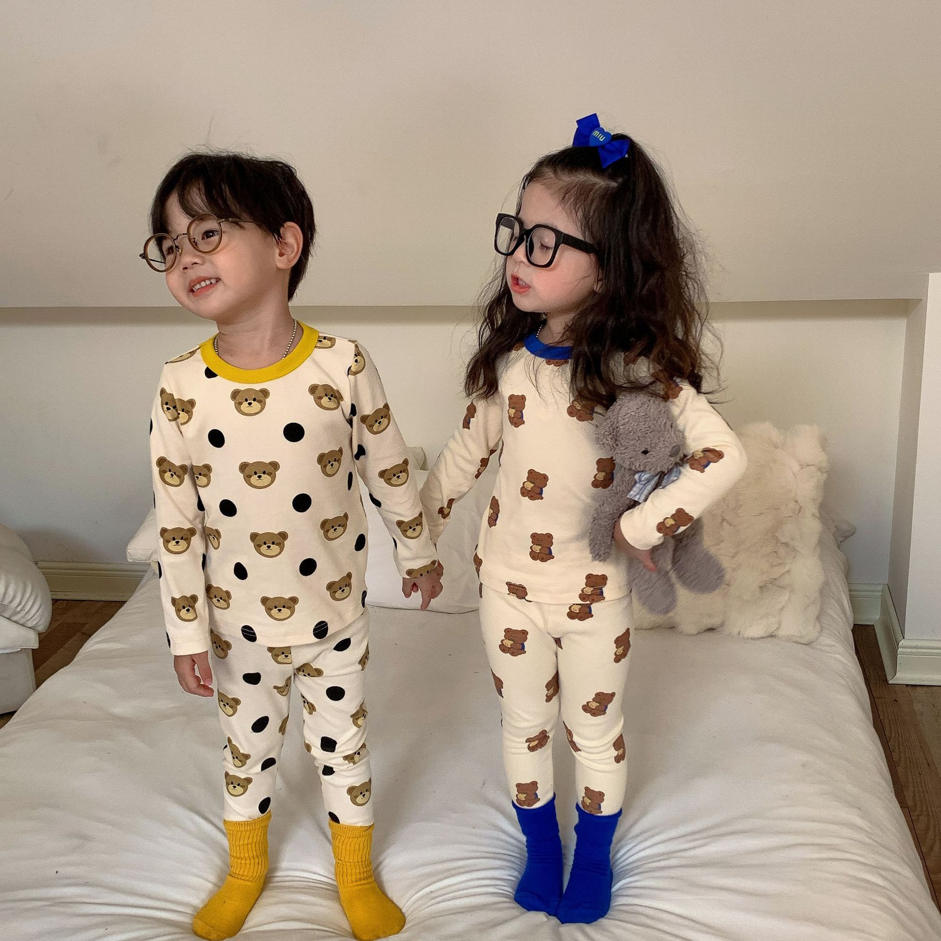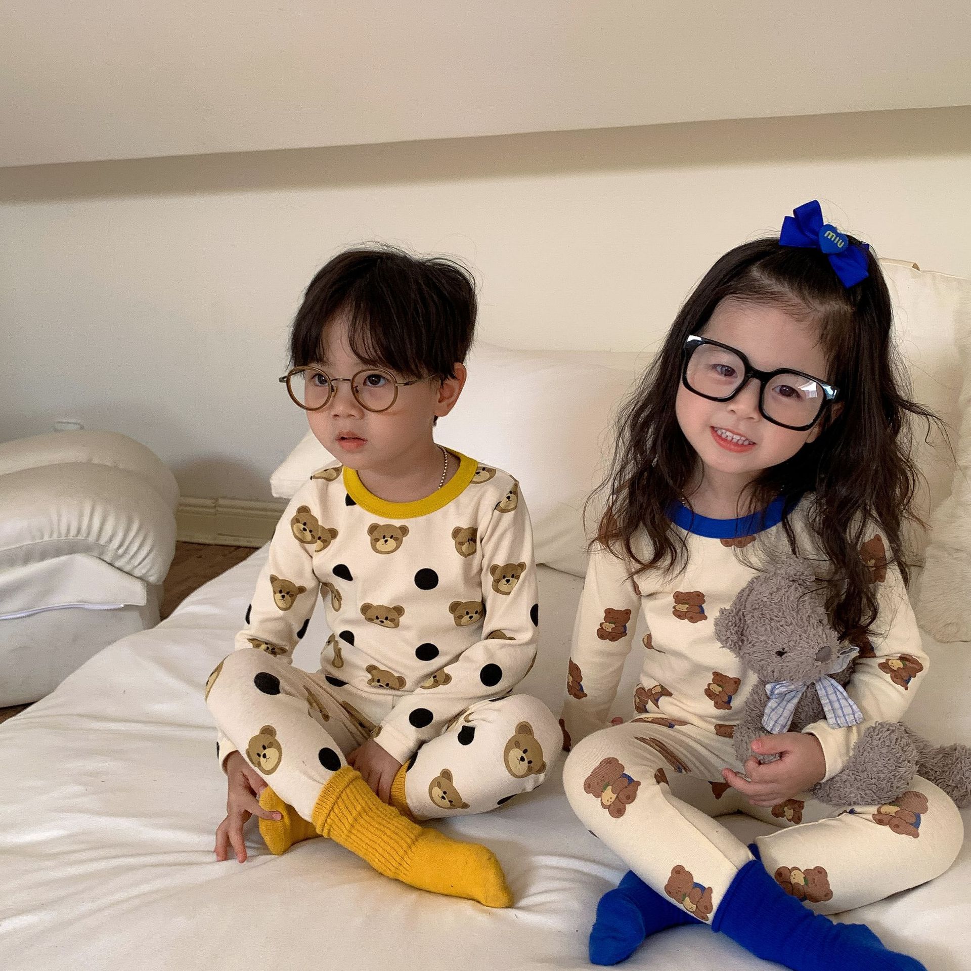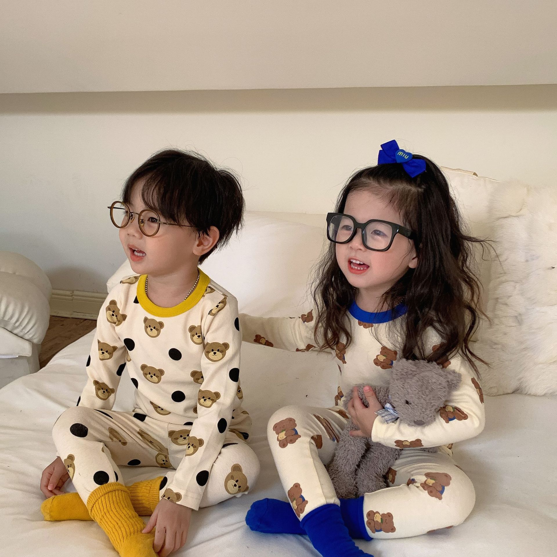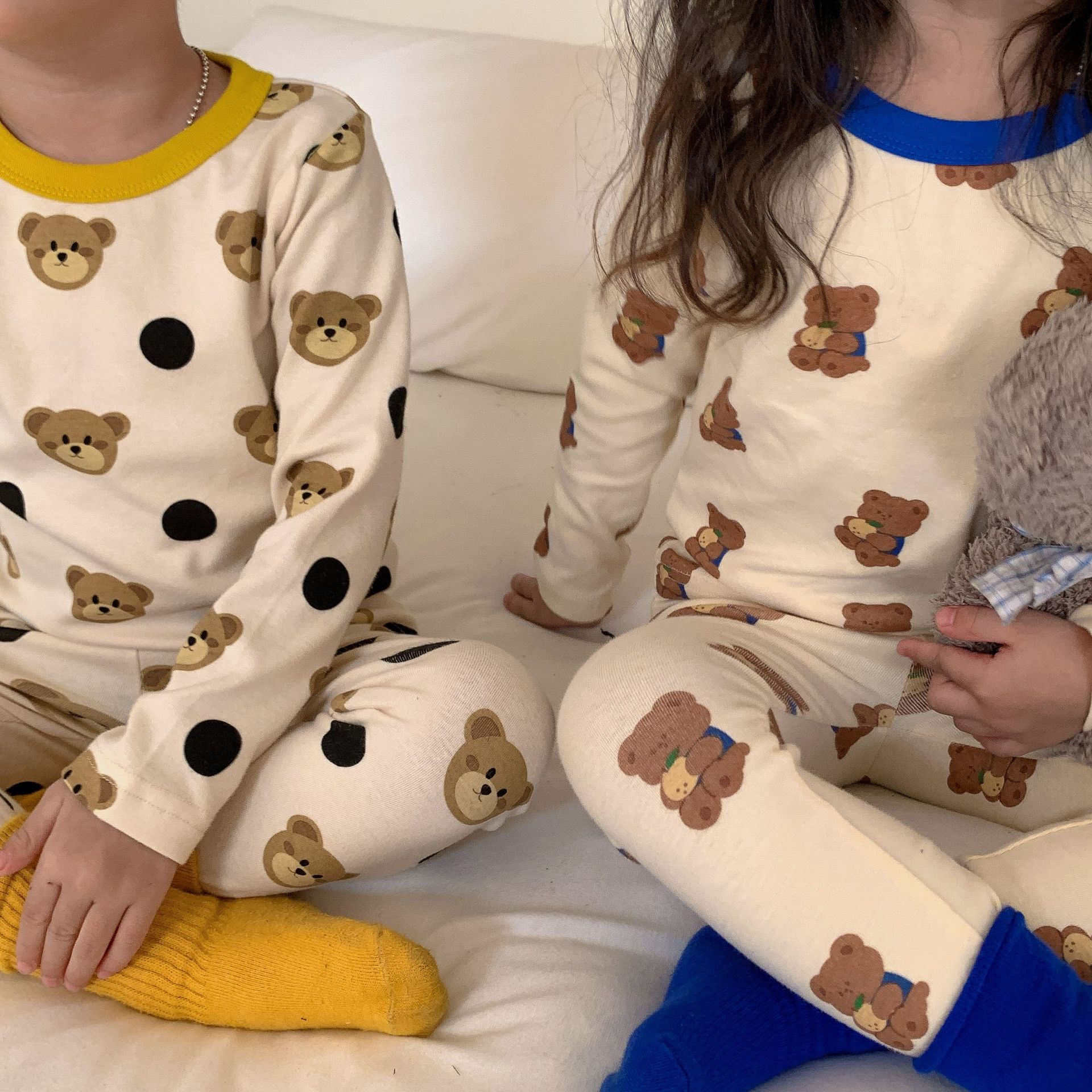 采用舒适面料,ins男女童春秋撞色包边圆领小熊秋衣秋裤长袖长裤家居服套装,