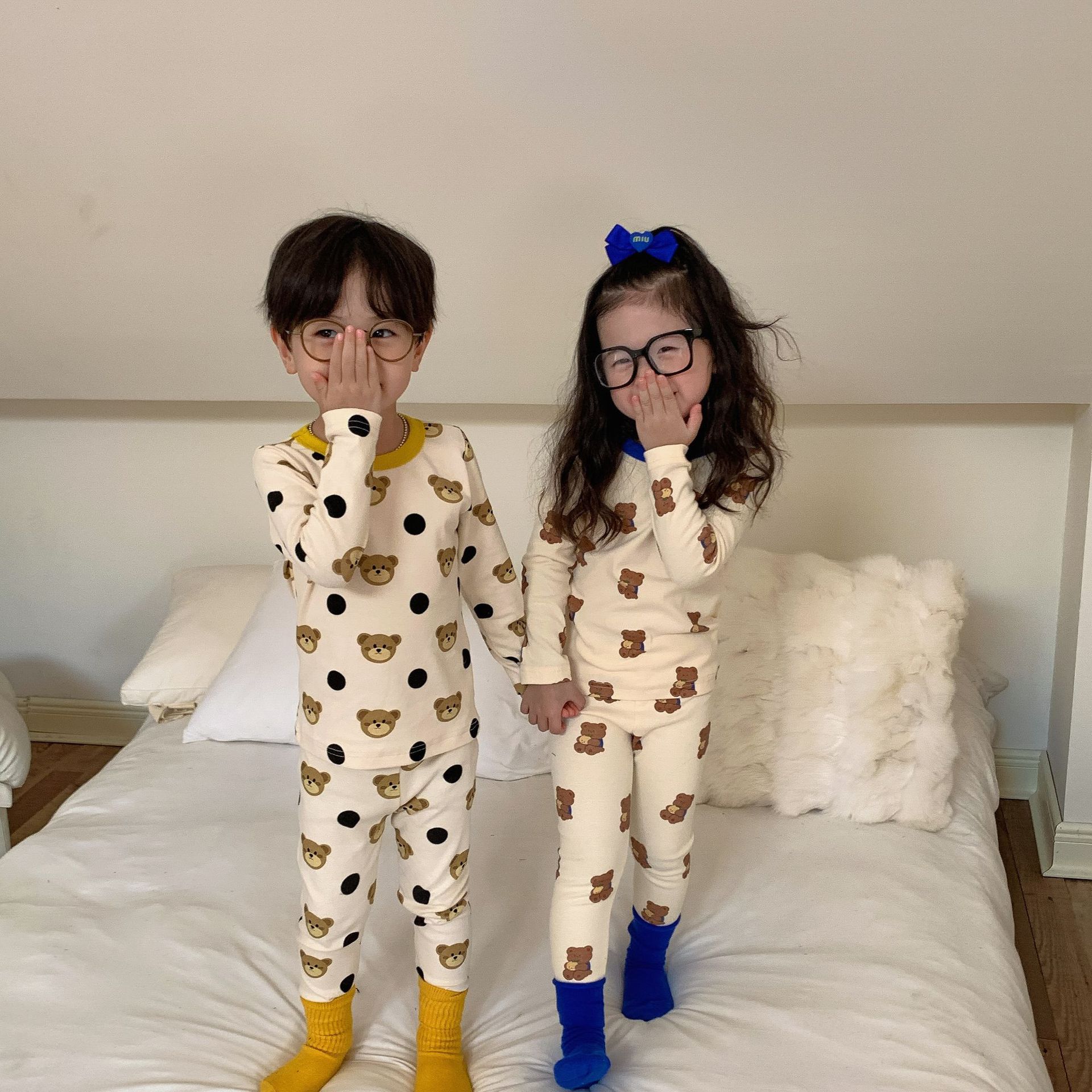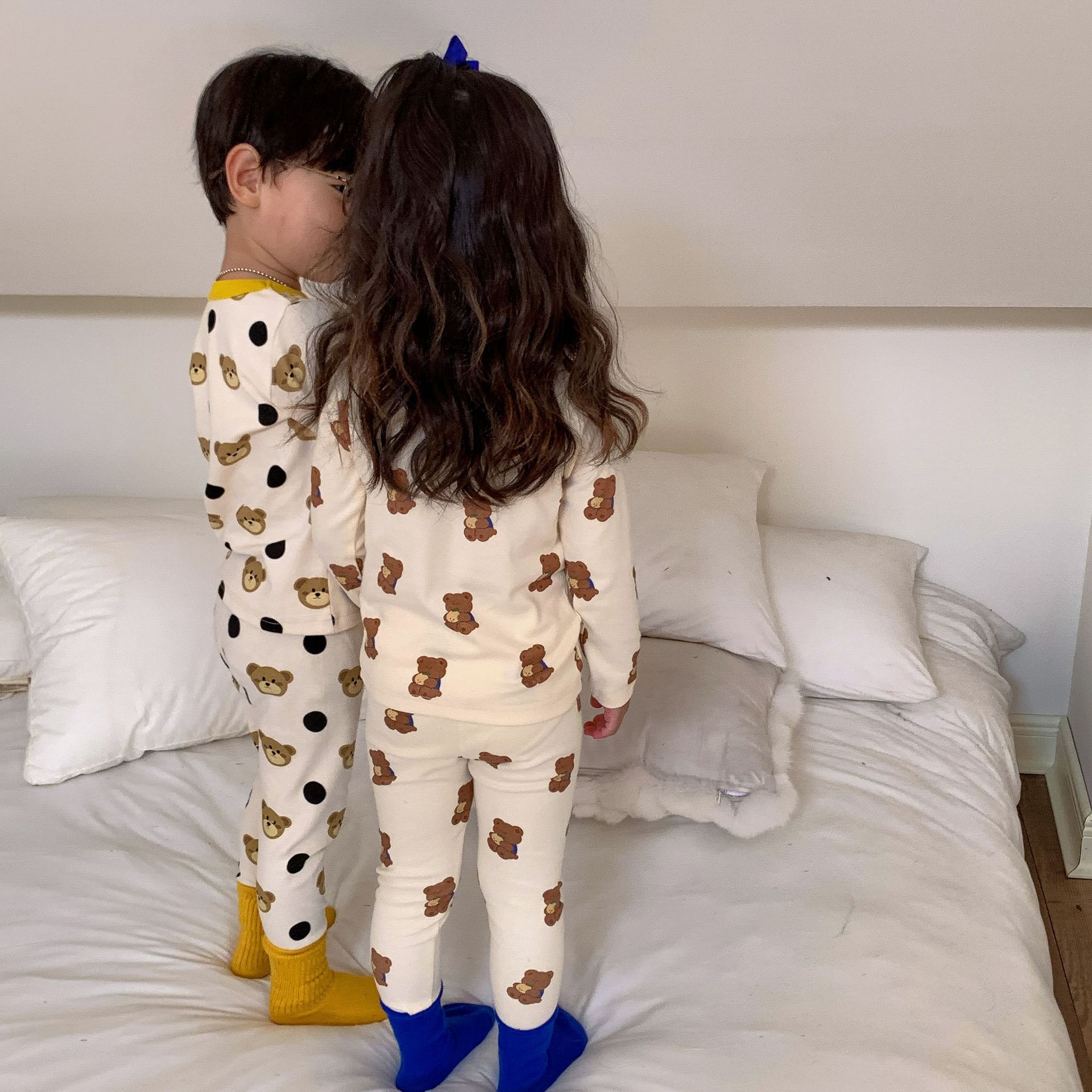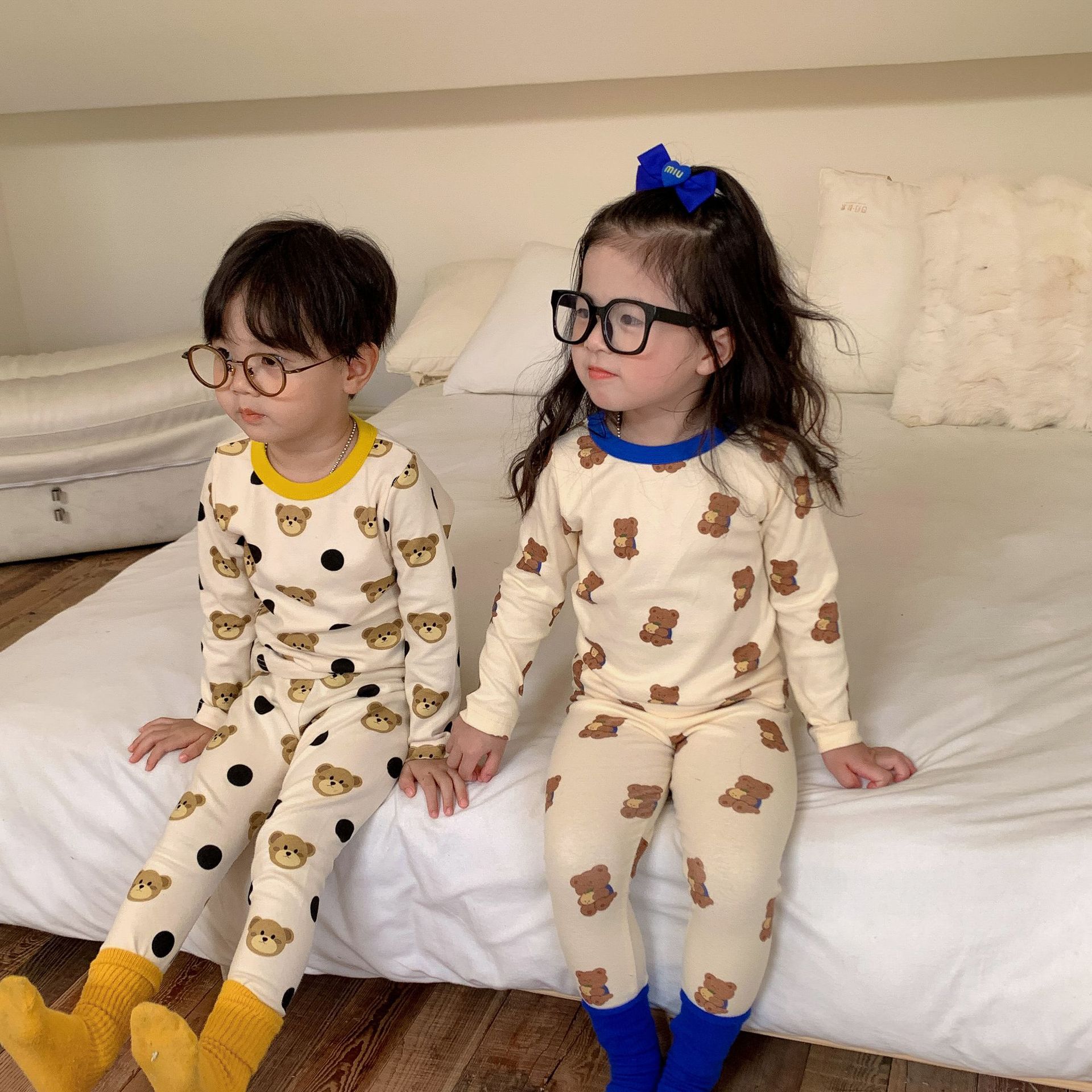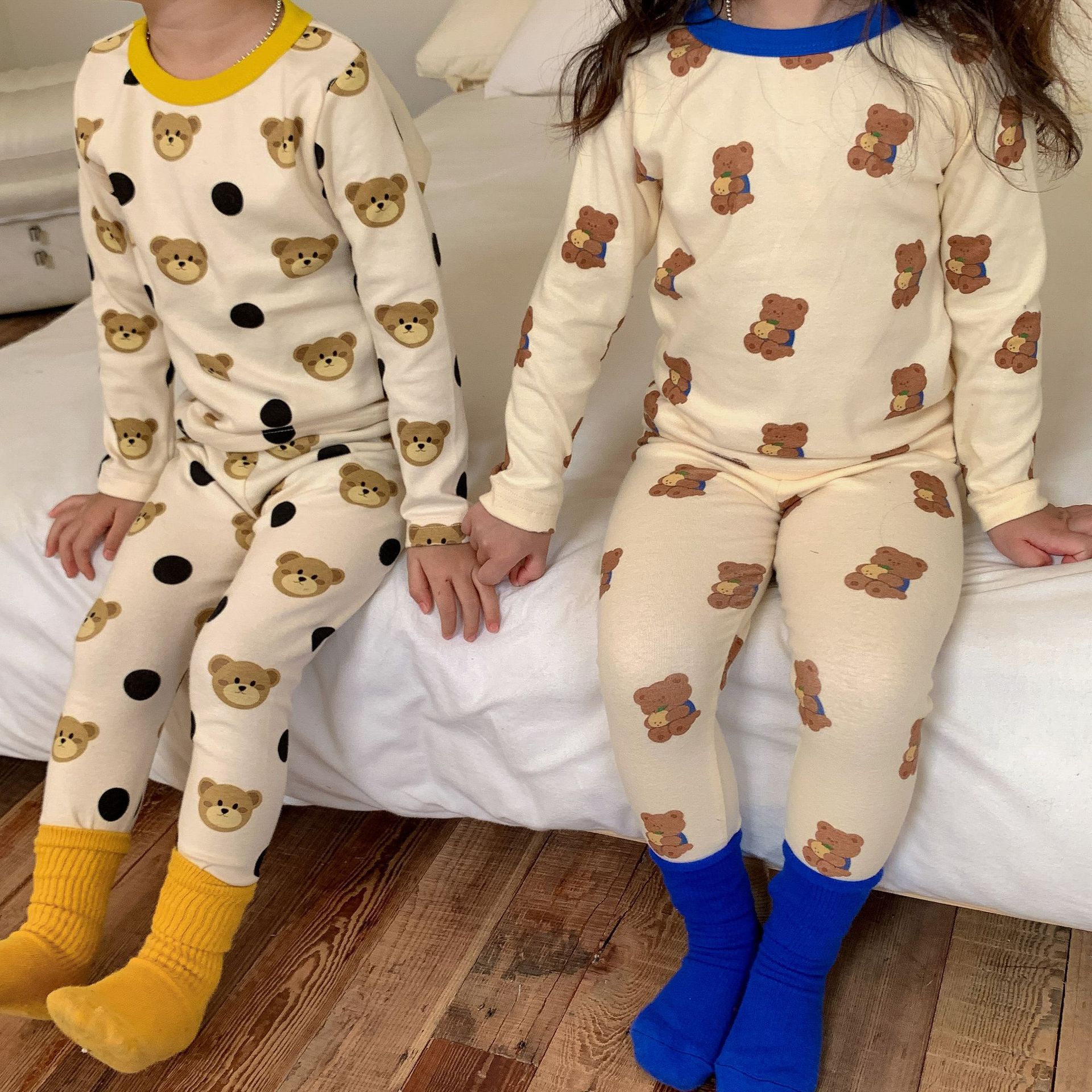 采用舒适面料,ins男女童春秋撞色包边圆领小熊秋衣秋裤长袖长裤家居服套装,