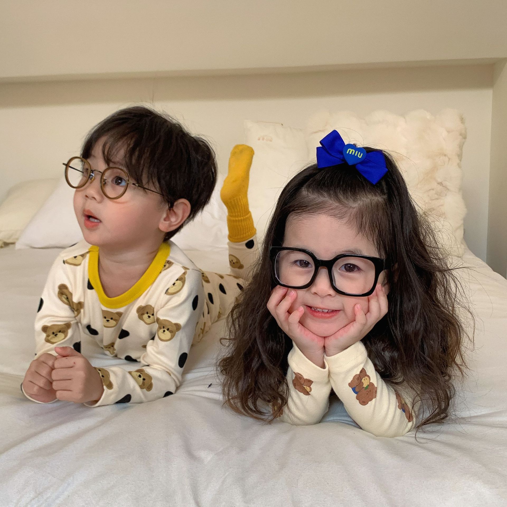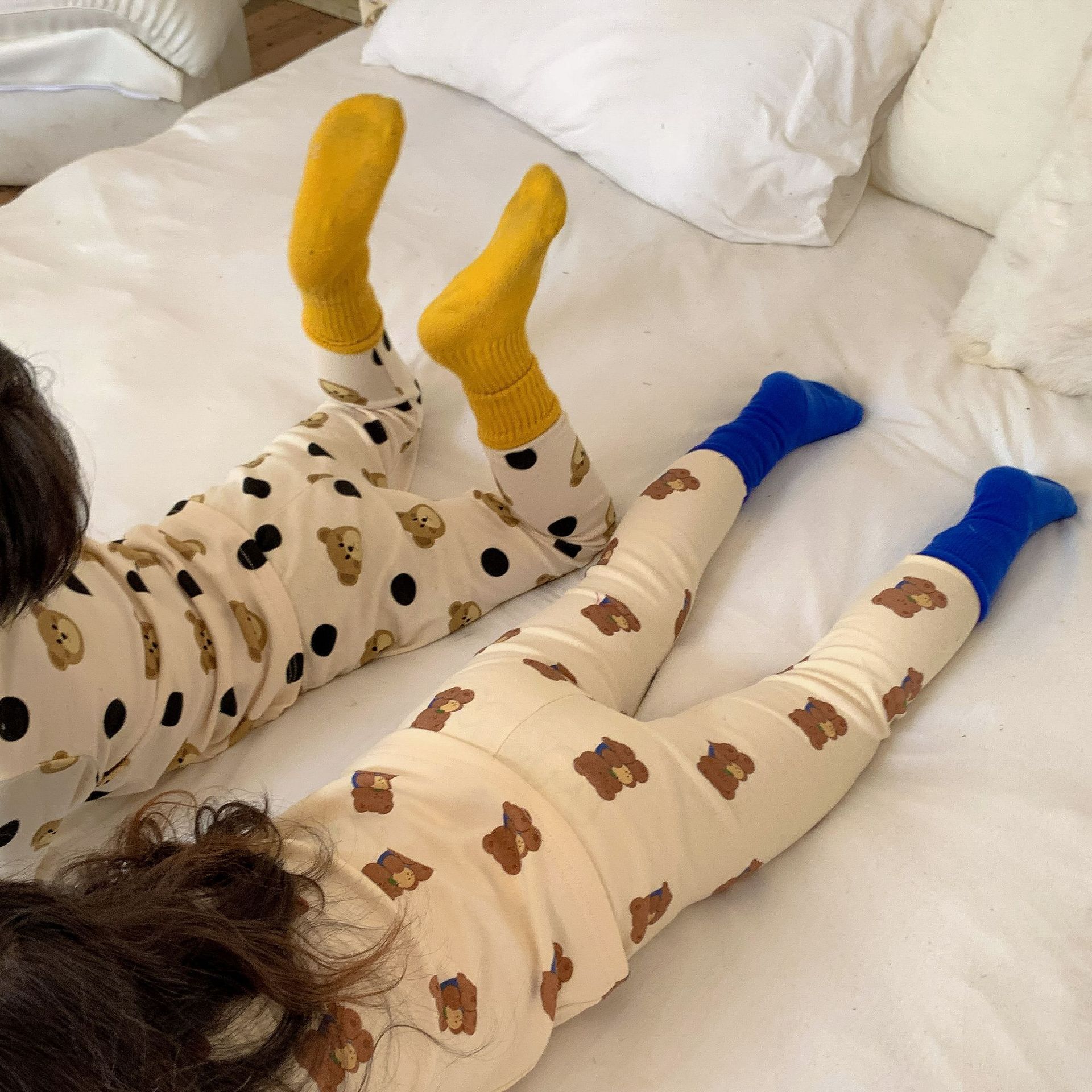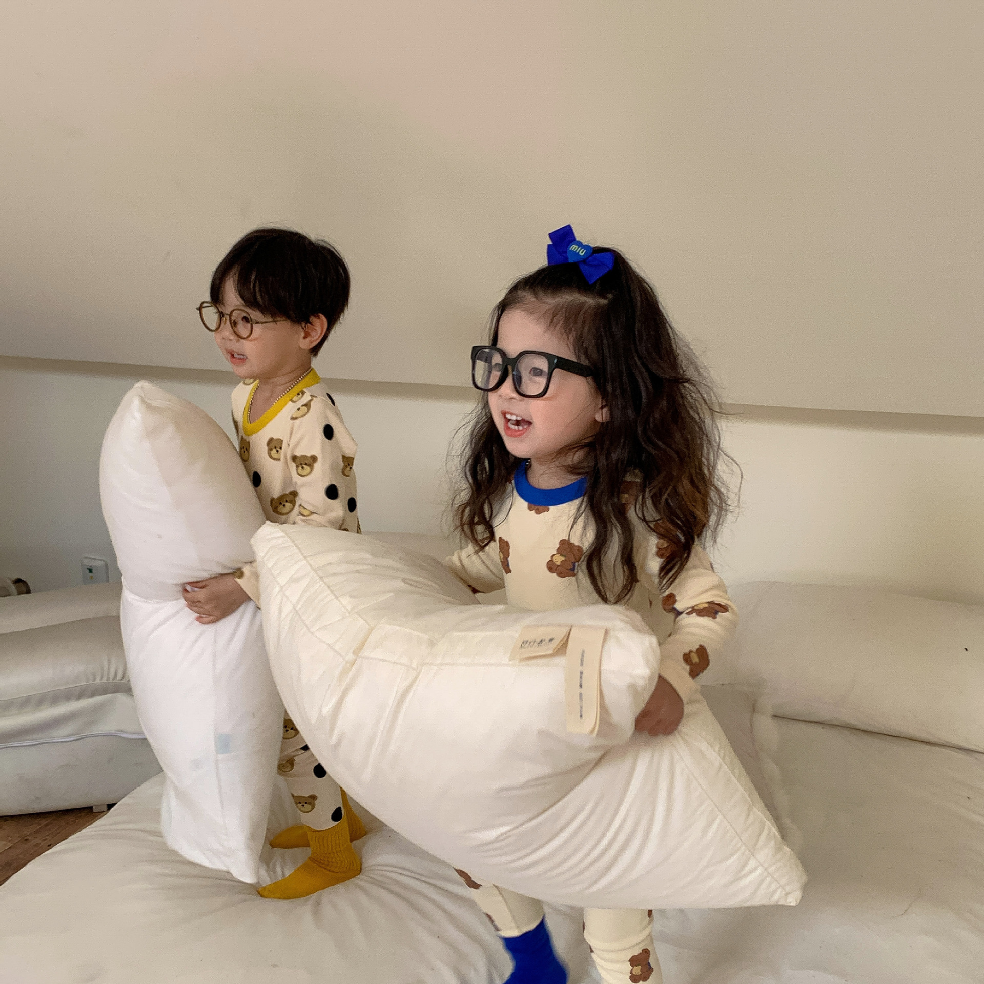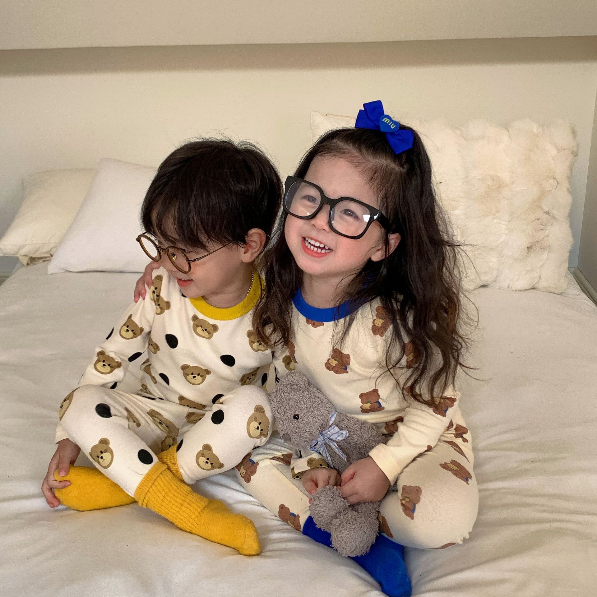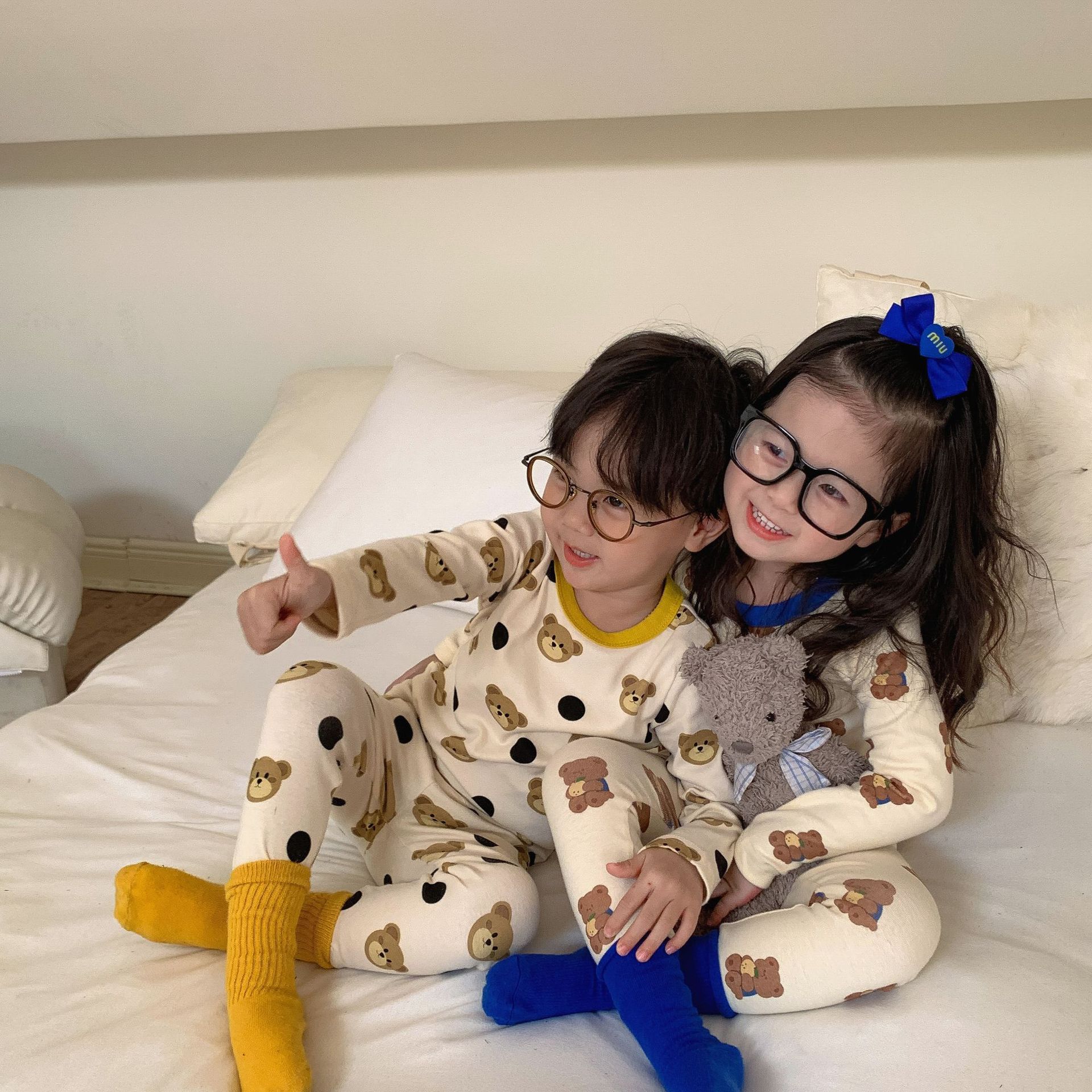 采用舒适面料,ins男女童春秋撞色包边圆领小熊秋衣秋裤长袖长裤家居服套装,