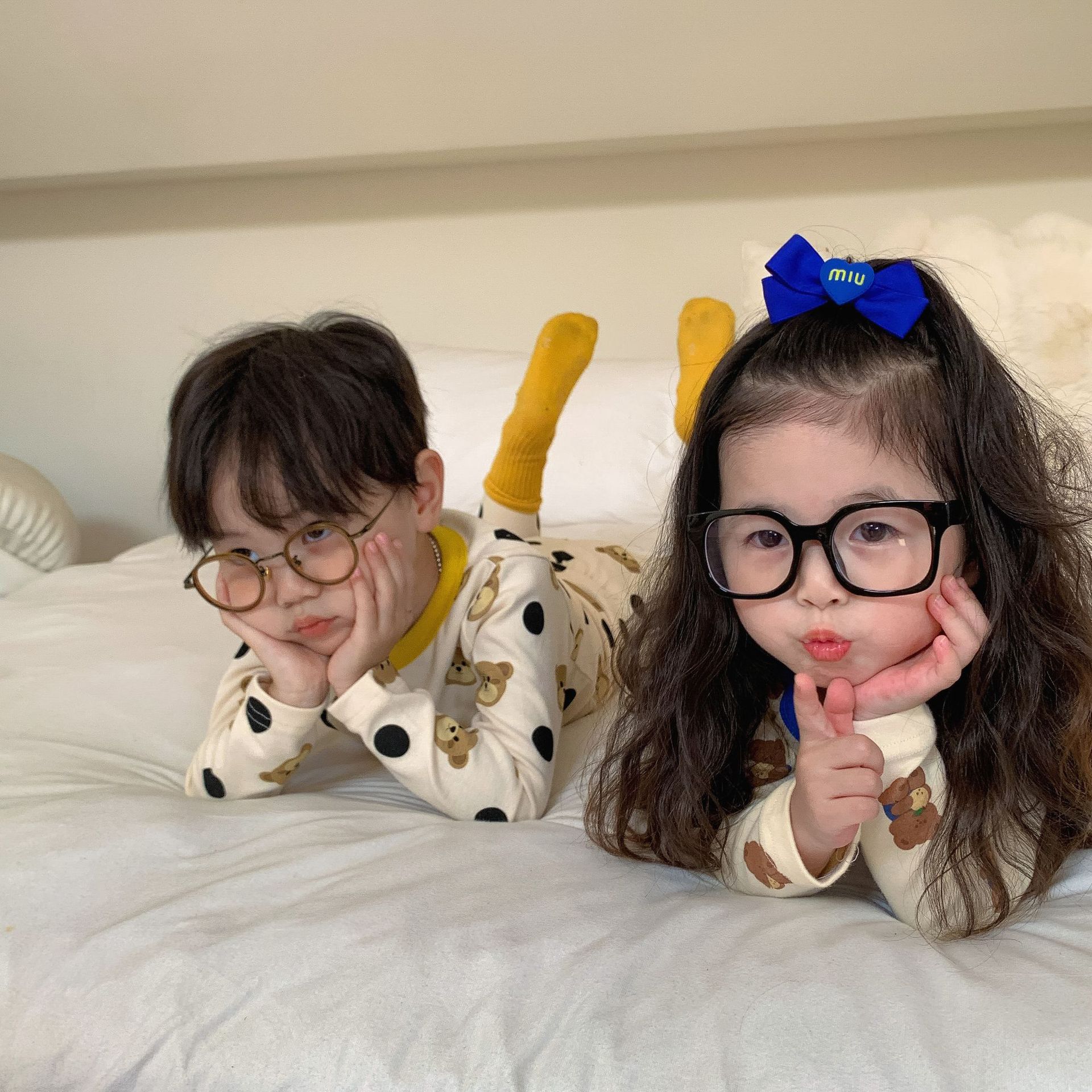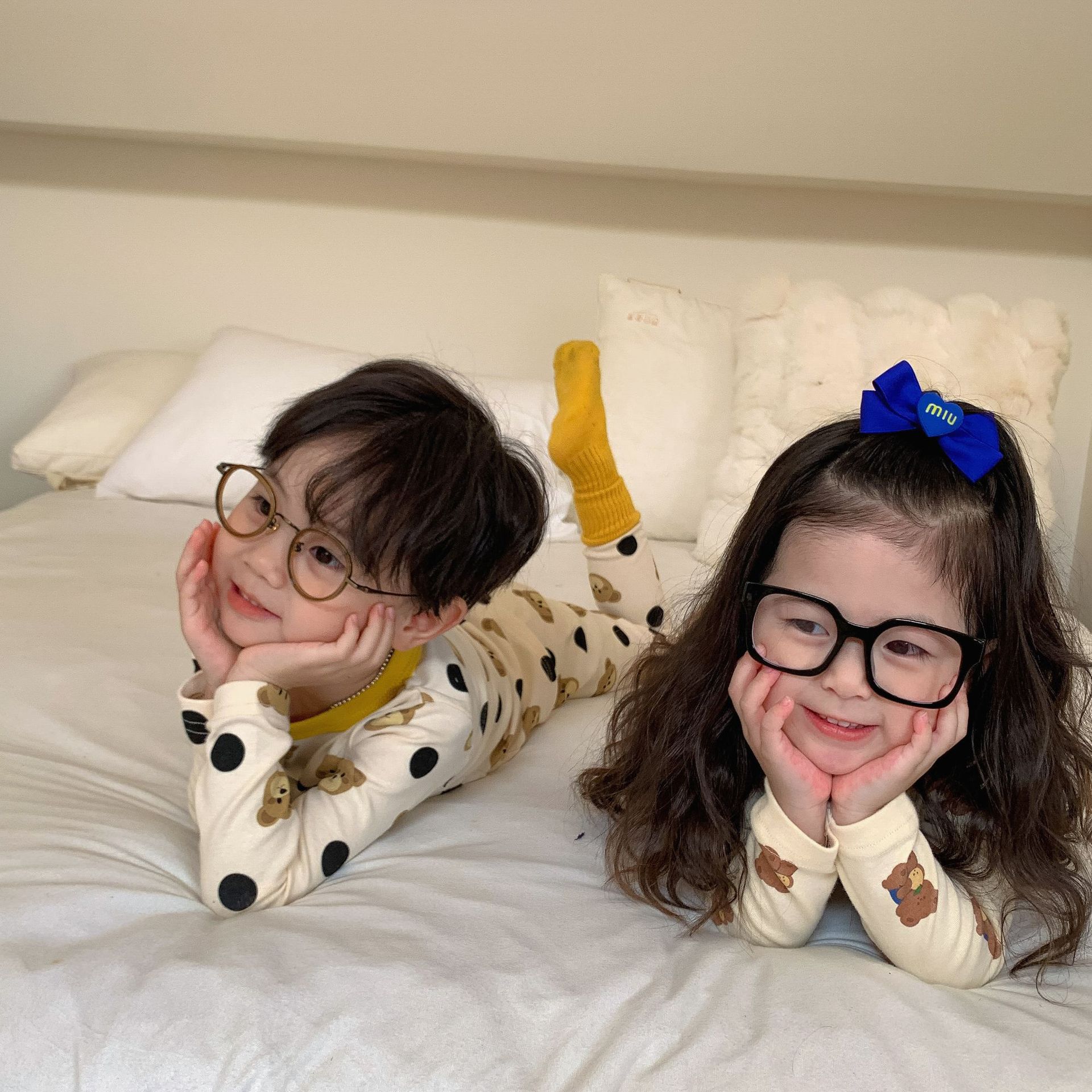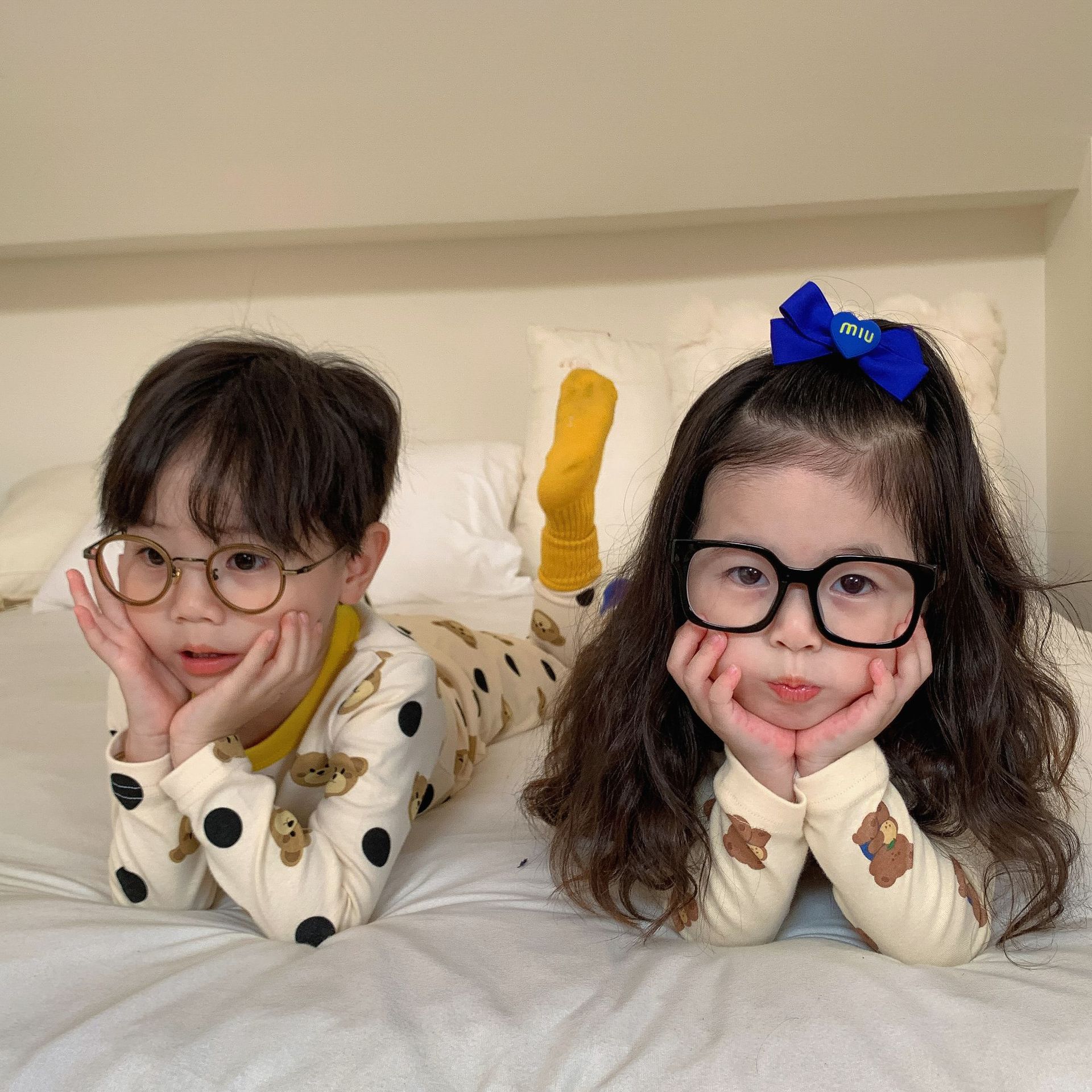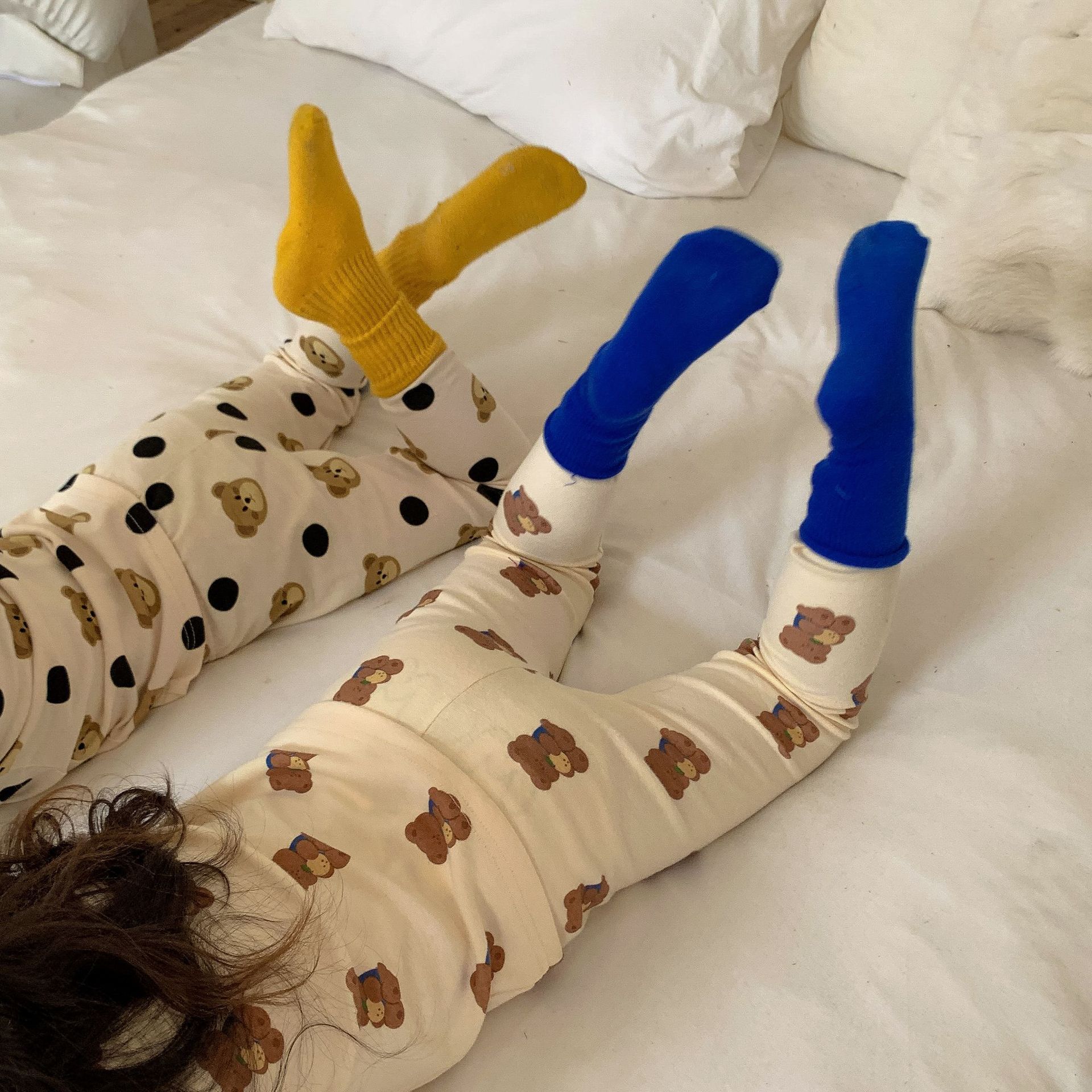 采用舒适面料,ins男女童春秋撞色包边圆领小熊秋衣秋裤长袖长裤家居服套装,