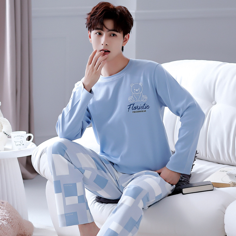 커플 잠옷 여자의 봄과 가을 긴 소매 격자 무늬 면 바지 크롭 바지 한국 스타일 만화 남자의 가정 옷 세트
