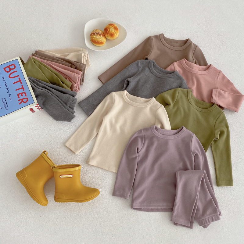 어린이 잠옷 2025 어린이 단색 홈웨어 잠옷 세트 남아 여아 보온 속옷 세트 호주산 양털