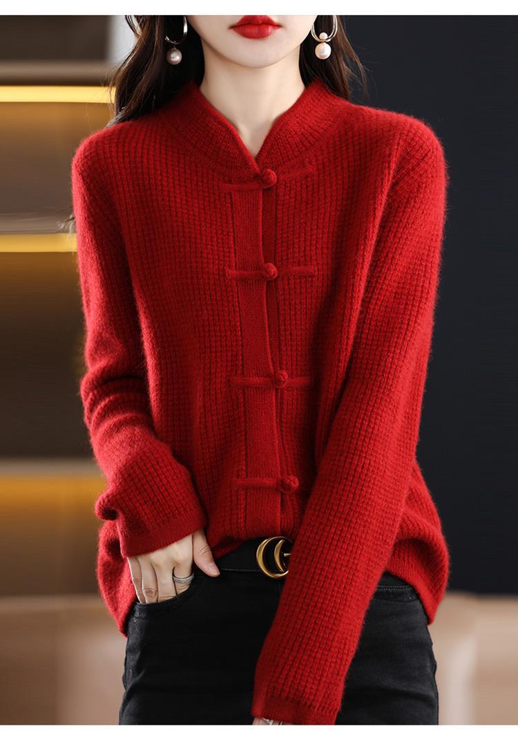 캐시미어 카디건 여성의 가을과 겨울 새로운 중국 레트로 반 높이 레드 스웨터 코트 느슨한 솔리드 컬러 울 탑