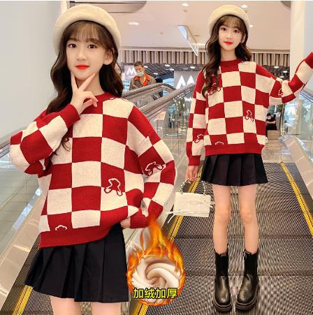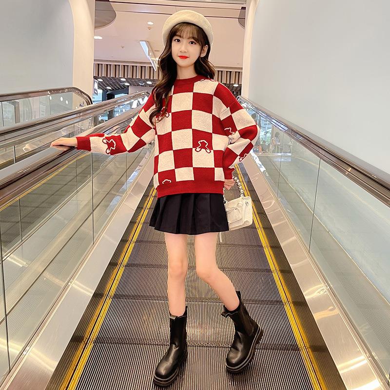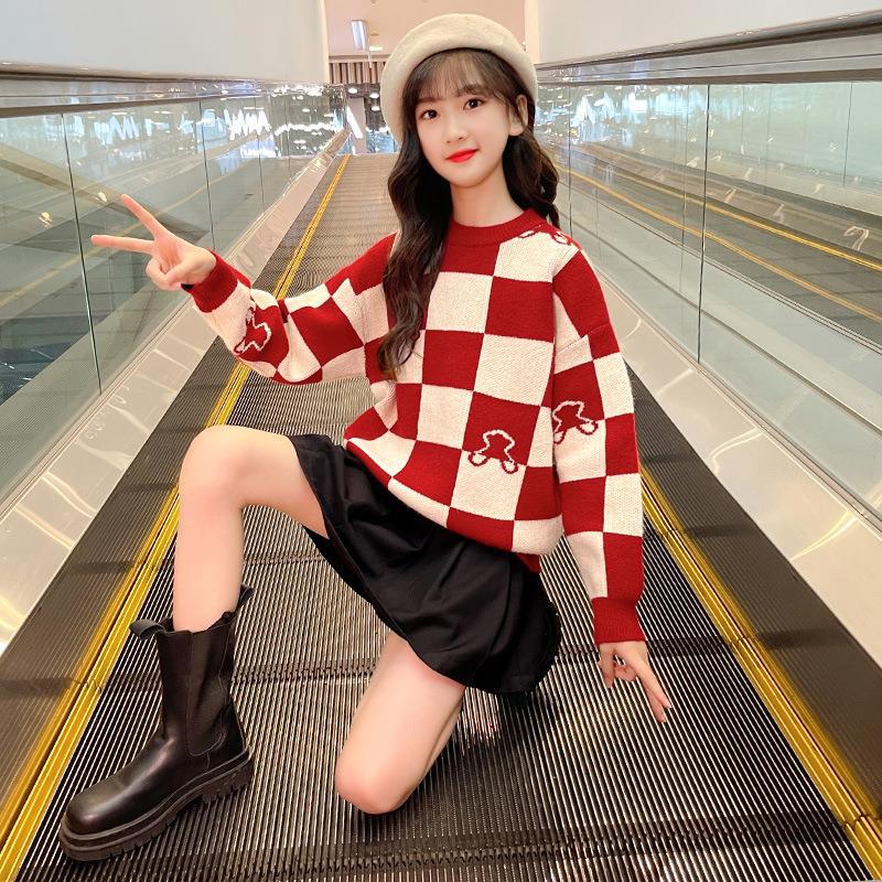 소녀의 격자 무늬 스웨터 가을 2022 새로운 스타일 소녀의 세련된 니트 셔츠 긴 소매 중간 큰 어린이 가을과 겨울 탑스토어 가기