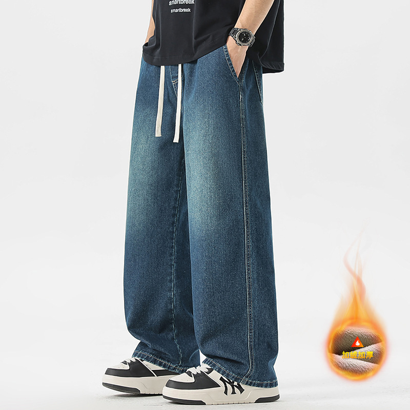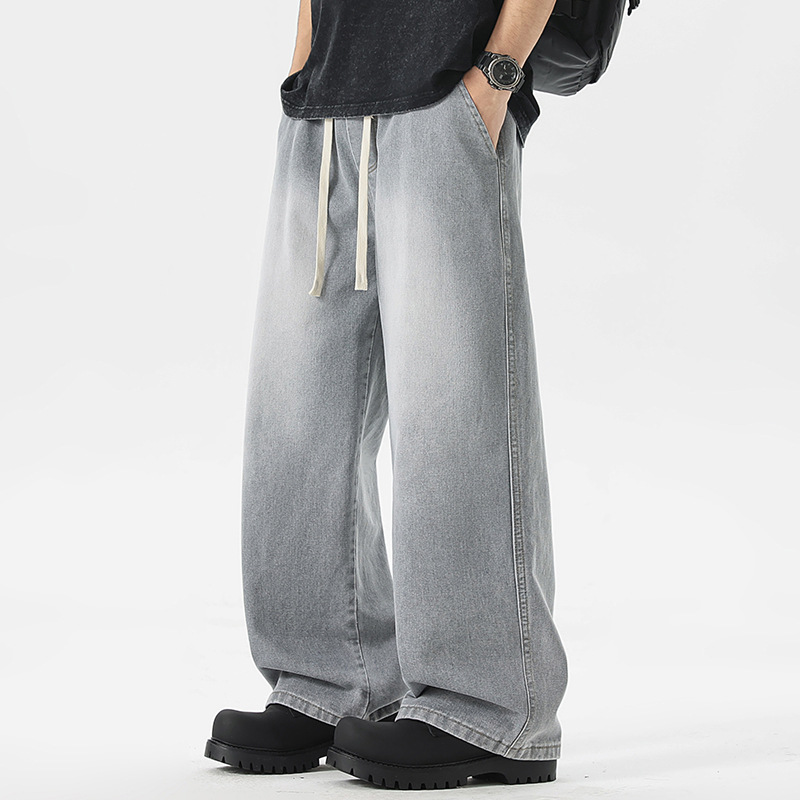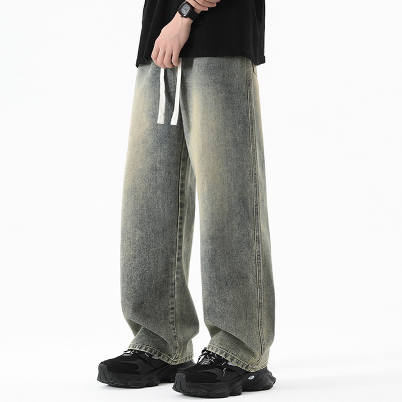 Muqiu 남성복 ∠ 미국식 하이 스트리트 화이트 와이드 레그 청바지 남성용 클린 핏 트렌디 브랜드 루즈 스트레이트 롱 팬츠스토어 가기