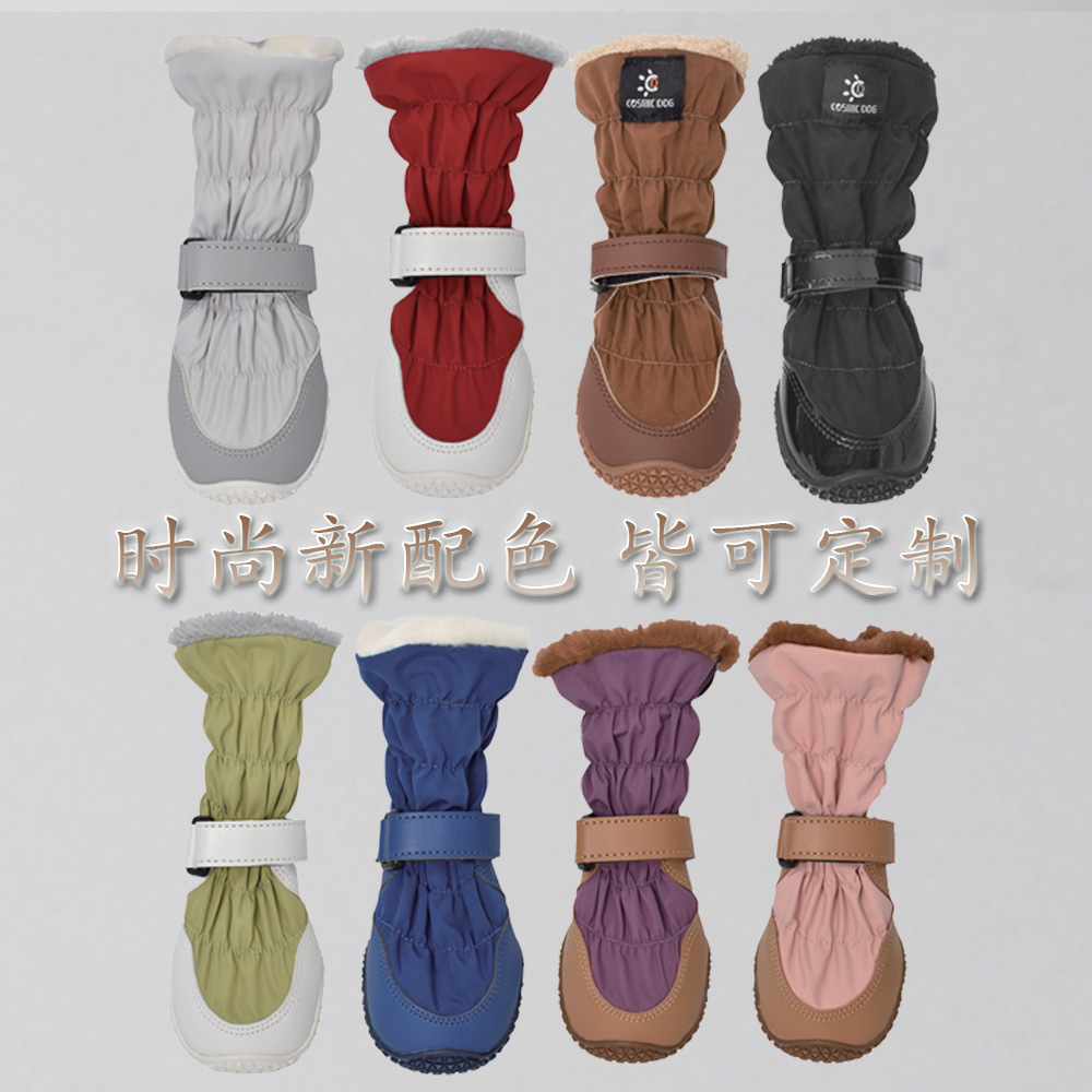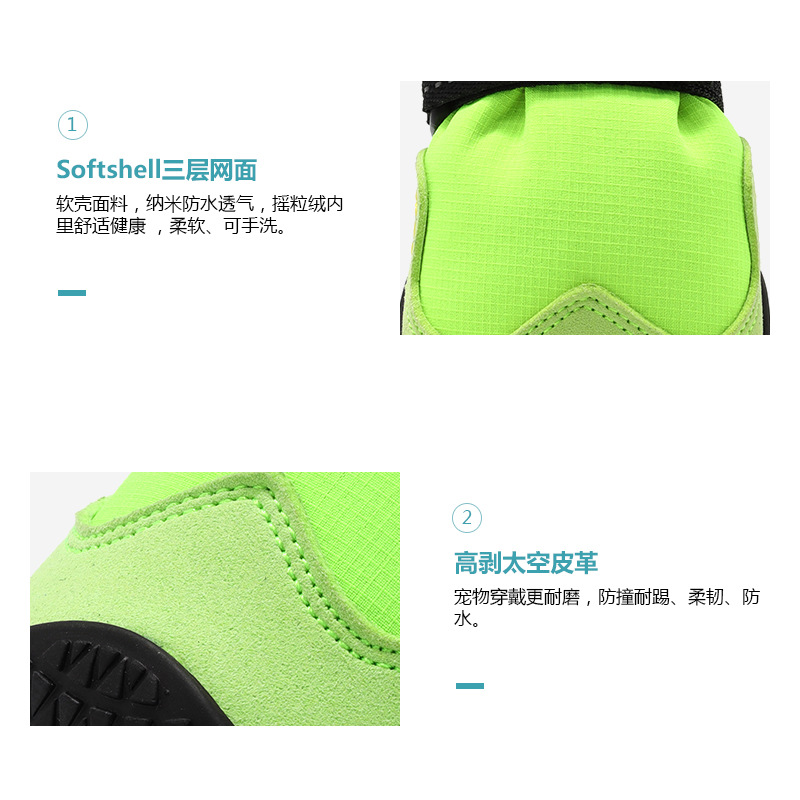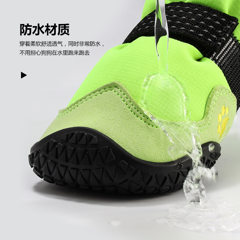 【本品特点】:本款鞋采用进口防泼水,透气,保暖,防风,材料(人用的登山服面料),外加反光条设计,狗狗脚穿柔软,舒服,具有比水分子密度小、比水蒸气密度大的功能,防闷、防臭、防泼水防雪的效果,橡胶耐磨防滑鞋底,狗狗穿着可以在雪地、冰川、丛林安全行走,是一双适合户外行动的宠物鞋!