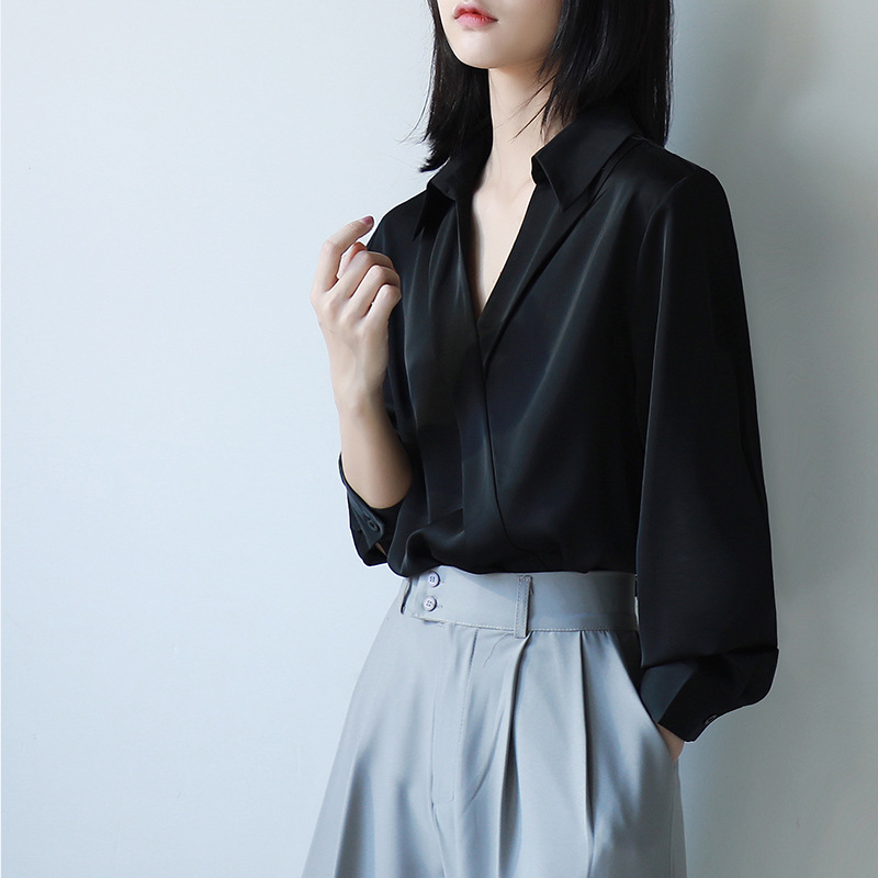 2022 봄 새로운 V-넥 긴팔 셔츠 여성용 블랙 디자인 센스 우아한 느슨한 슬리밍 쉬폰 탑스토어 가기